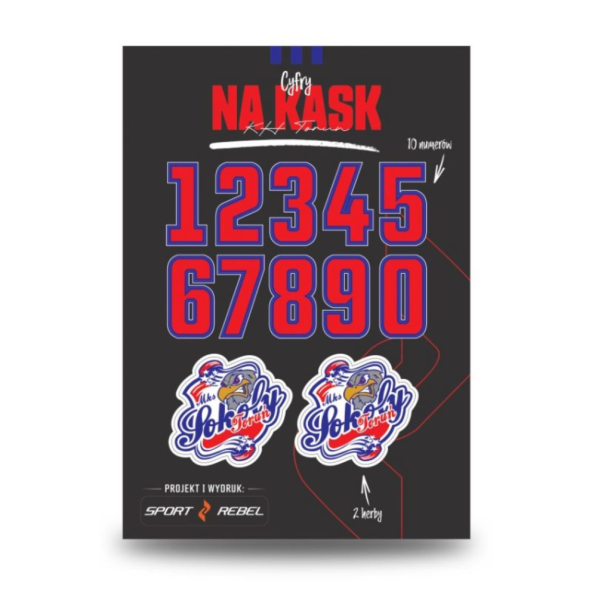 Sokoły Toruń Helmet Numbers: The Sokoły Toruń Helmet Numbers are a set of high-quality stickers created for hockey players and fans who want to personalize their equipment in the colors of their beloved club. Key features: Official design: The set includes the numbers 0-9 in club colors with a distinctive outline. High-quality printing: The stickers are moisture- and abrasion-resistant, making them ideal for games and training. Additional crests: The set includes two stickers featuring the official Sokoły Toruń club crest. The Sokoły Toruń Helmet Numbers are the perfect way to show your club affiliation on and off the ice!