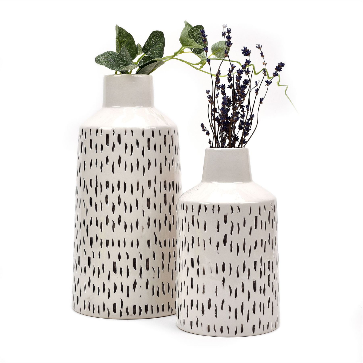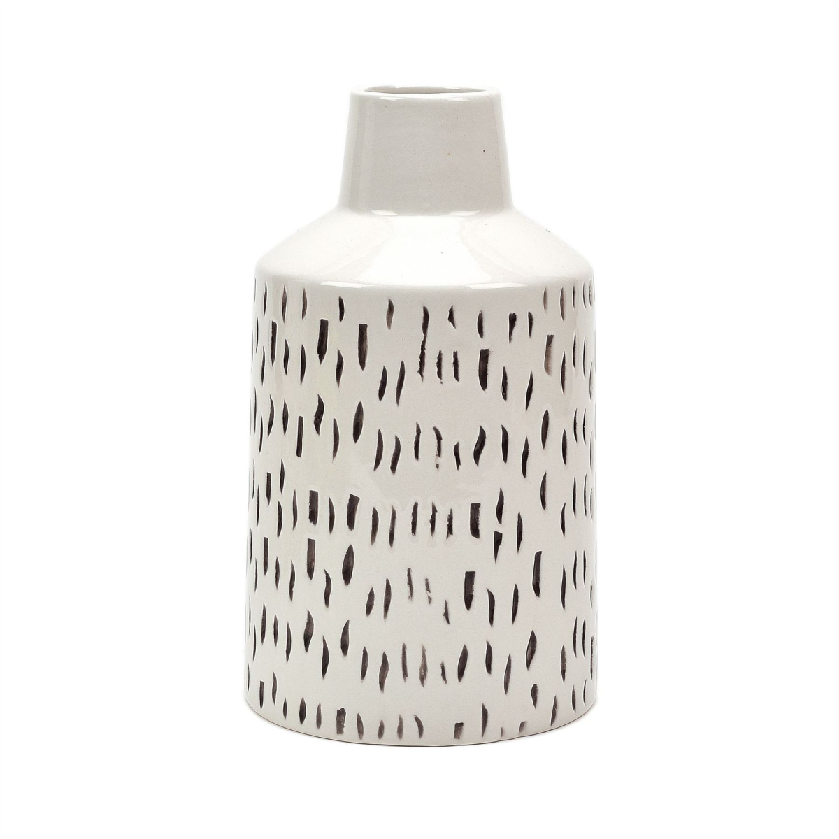 Bring some contemporary style and minimalistic elegance to your home with this ceramic vase ornament. From the Exhale collection by HESTIA� - bringing that Scandi hygge to your home. Details: - Bottle shaped white ceramic vase - Black textured flecked pattern - Perfect perched on a shelf or mantel - Ideal for holding a flower arrangement or as a standalone ornament