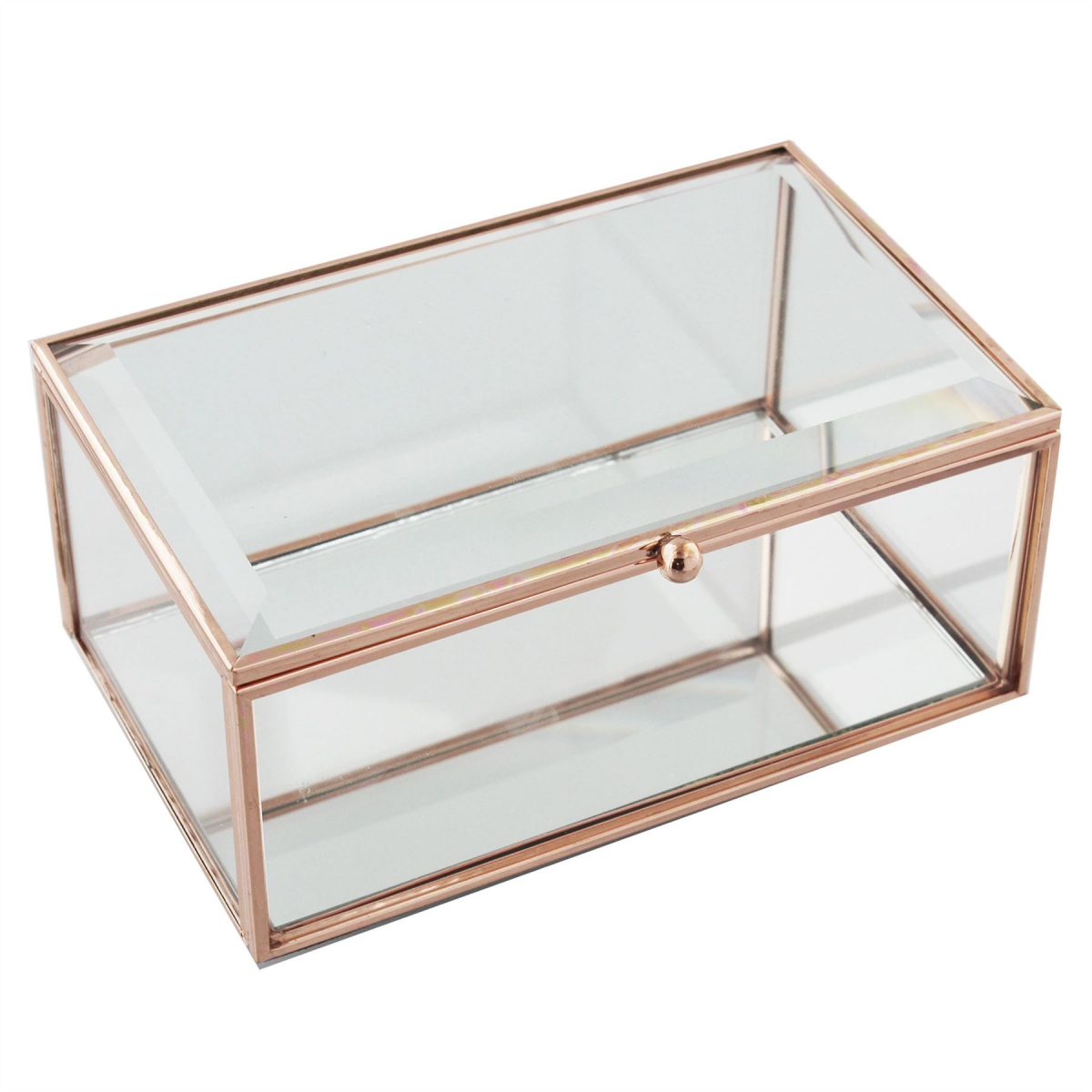 A clear glass jewellery box with Rose Gold edging, measuring 16 cm x 10 cm. From the Refined Glamour collection by HESTIA� - a perfect fusion of Art Deco radiance and that signature HESTIA� elegance.