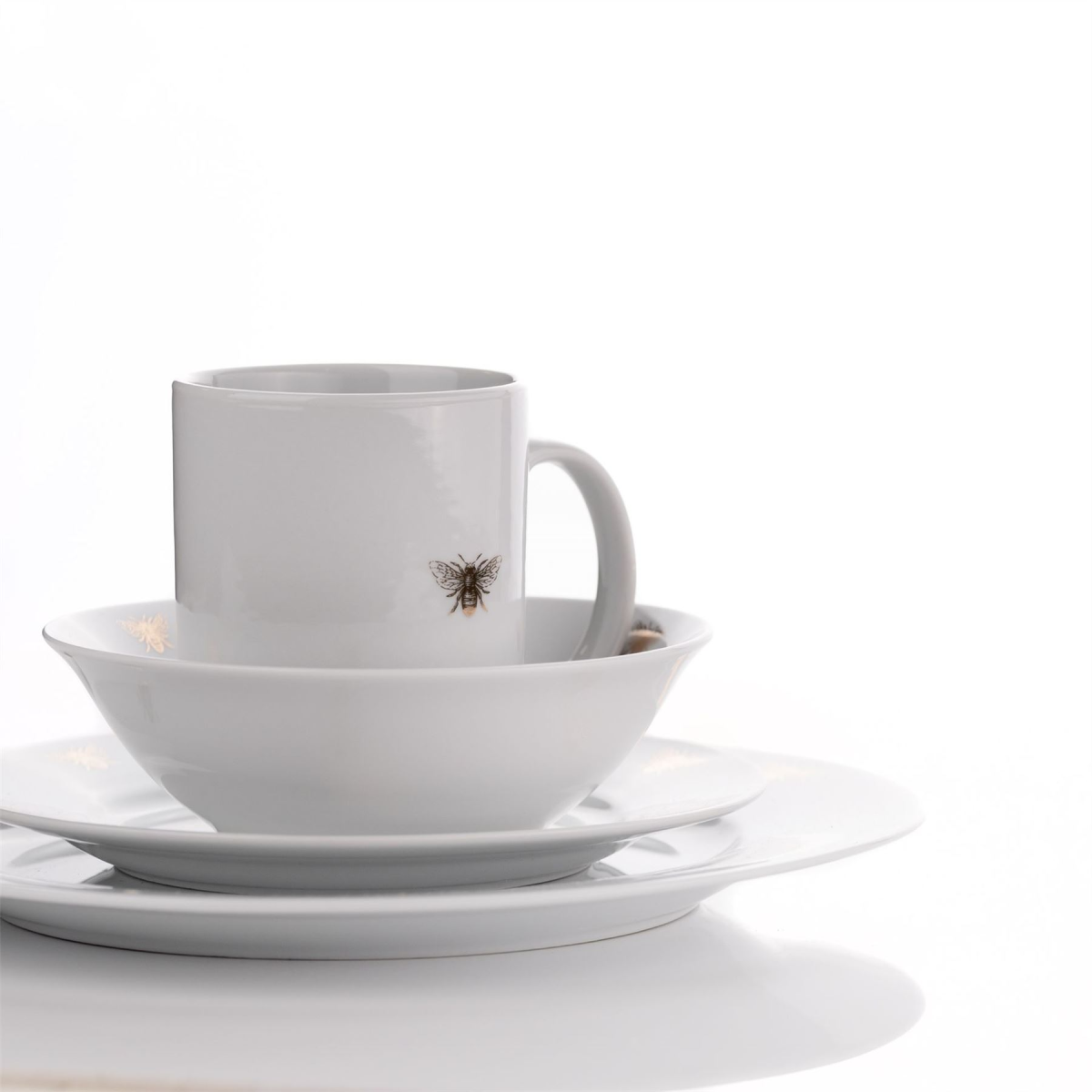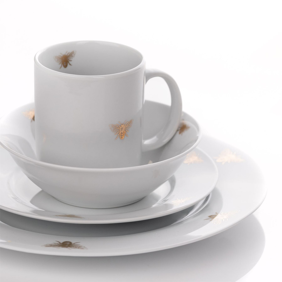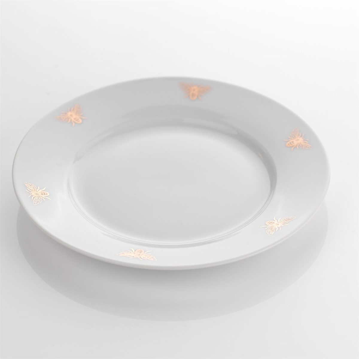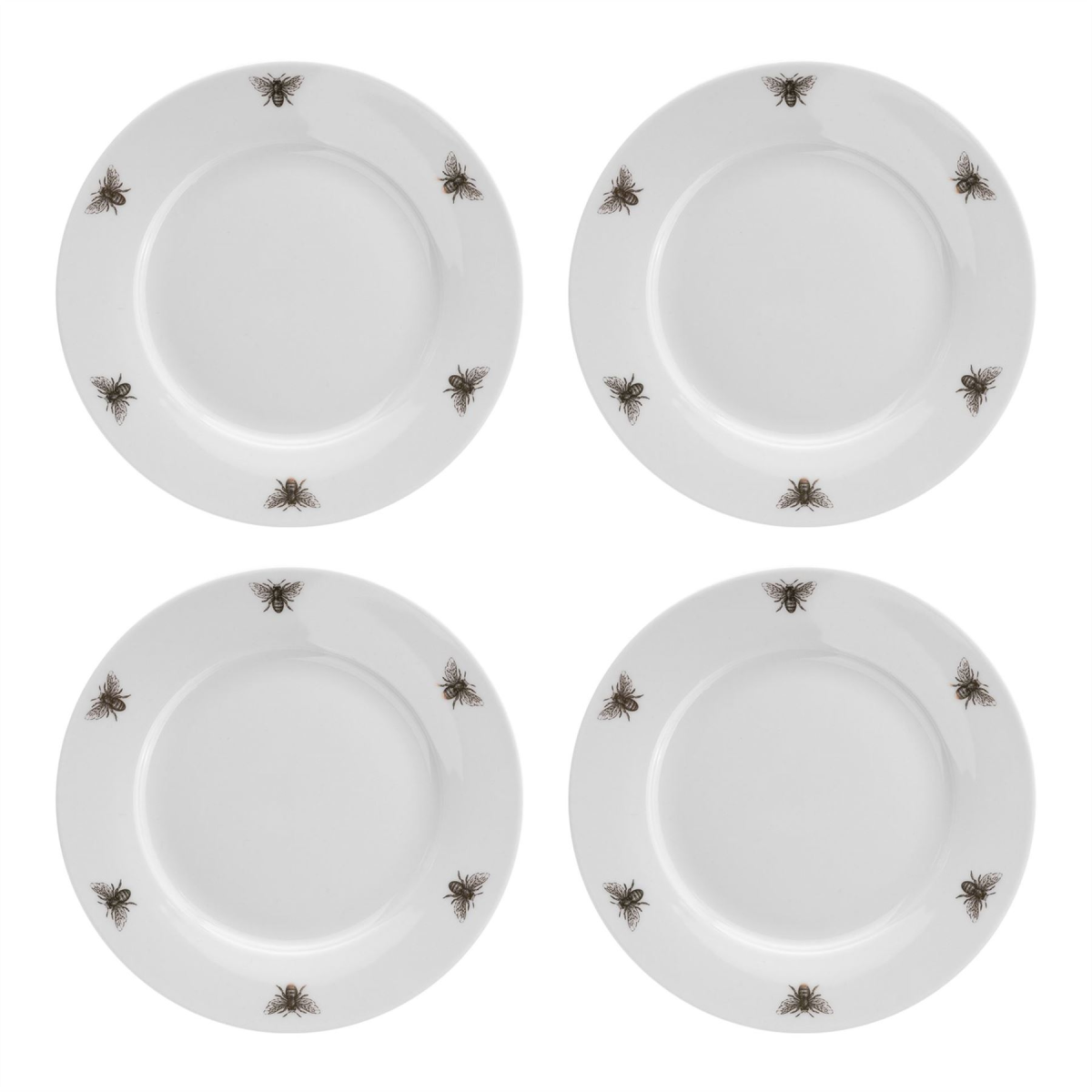 A set of four gold bee side plates from the Reconnect collection by HESTIA� Rejuvenate your home dining experience with this on-trend dinnerware set which connect your home with nature. The white, porcelain side plates offer classic design, complete with gold bee motifs, which form part of a wider range of matching items to transform your dining table.