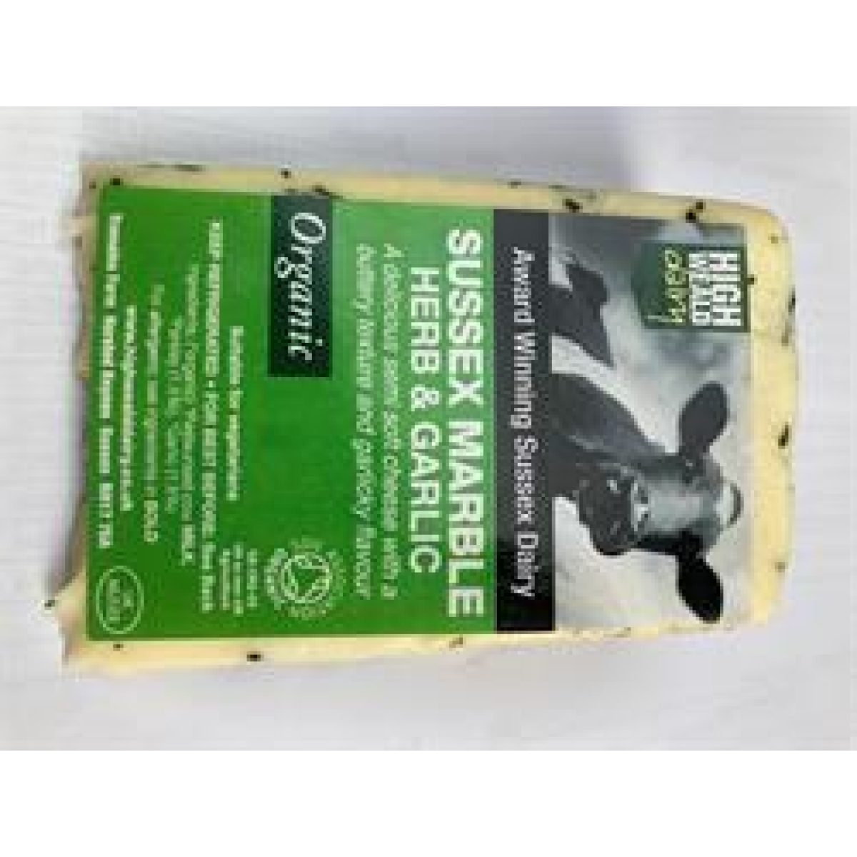 Organic Sussex Marble is a matured semi soft cheese with a rich buttery texture and an attractive appearance and vibrant flavour due to the addition of garlic and herb.