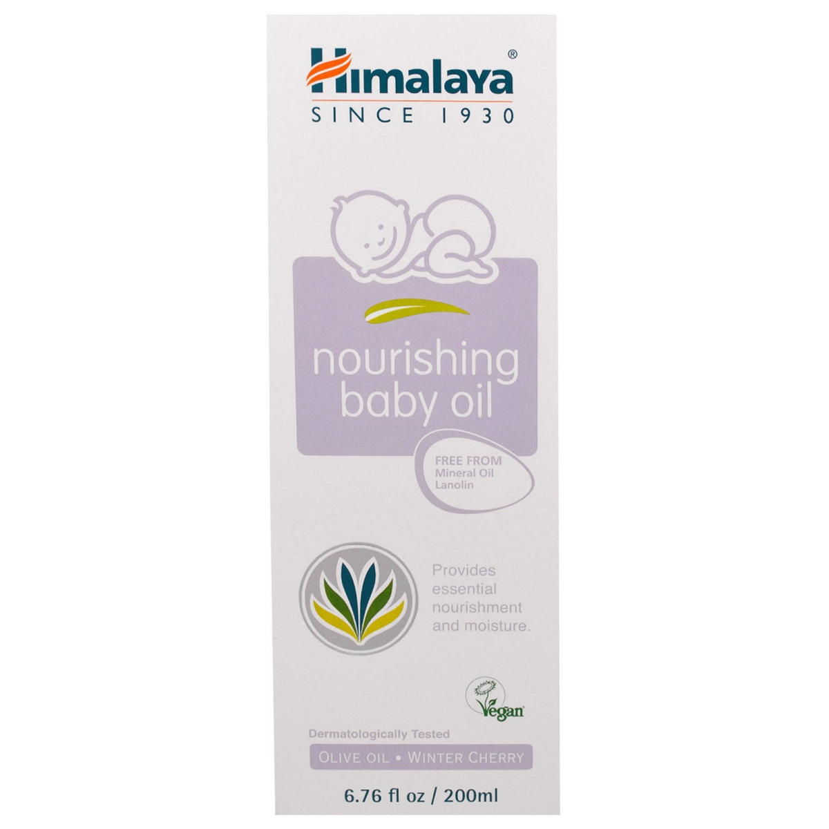 Since 1930 Free From: Mineral Oils - Lanolin Provides Essential Nourishment and Moisture Vegan Dermatologically Tested Hypoallergenic Mildness Tested Himalaya babycare products are specially formulated for your baby's delicate and sensitive skin. Clinically tested for mildness, these products maintain the fragile balance and well-being of your baby's skin. Enriched with Olive oil that nourishes, Winter Cherry helps support healthy skin tone and Aloe vera that moisturizes the skin. An excellent massage oil for your baby.