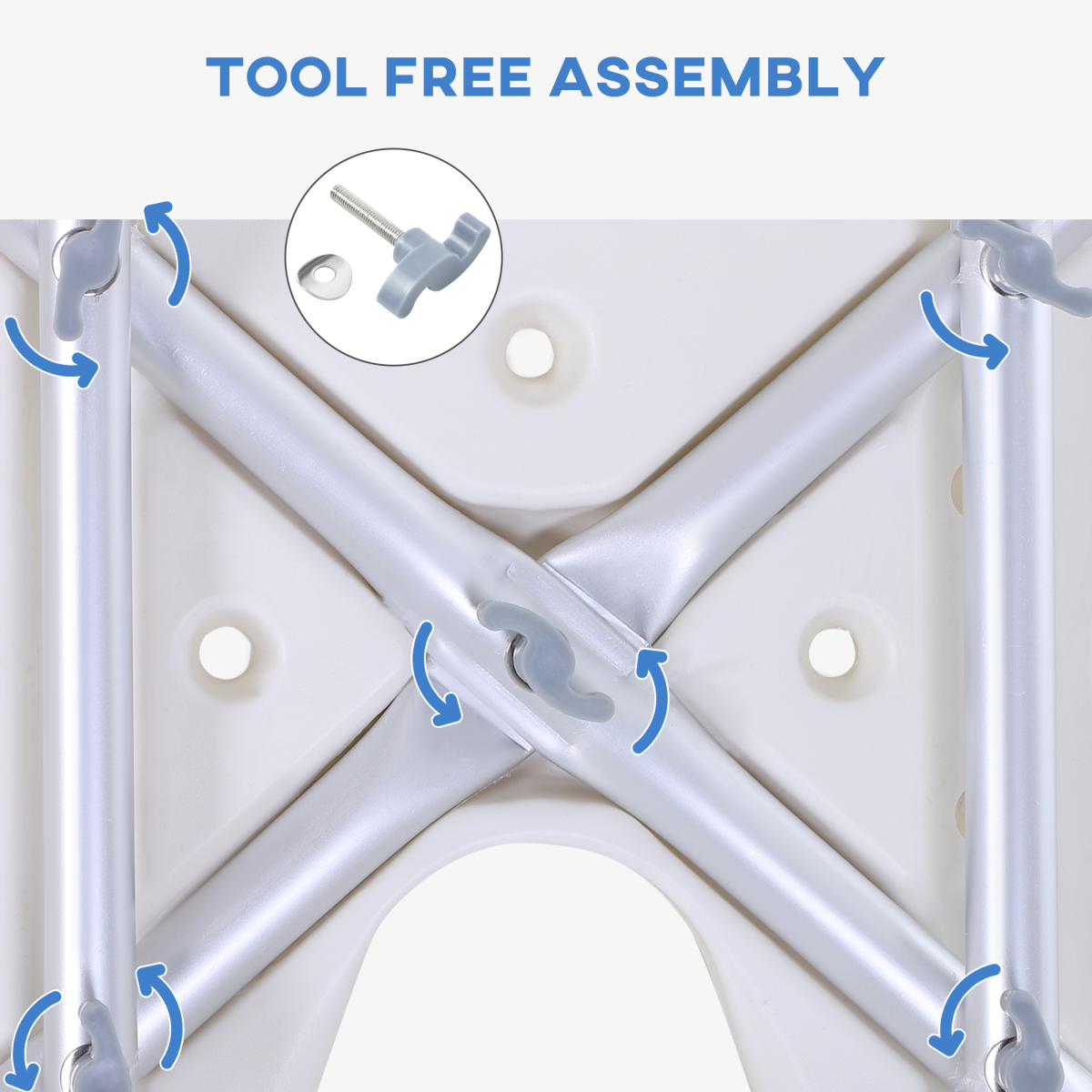 BATHROOM ASSISTANCE: Made to give anyone who needs a place to rest whilst in the shower or bath. Ideal for the elderly, pregnant and even in care home environments.ADJUSTABLE HEIGHT: Aluminium legs for resistance and protection in water can be adjusted to eight different levels - suitable for almost everyone.'U'SEAT WITH DRAINAGE HOLES: Made from hard plastic for durability, no water build up will occur. NON-SLIP FEET: Creates friction to prevent chair from slipping or moving for safety.PORTABLE: Lightweight with a handle on the back and sides, easy to pick up and carry. DIMENSIONS: 71-83.5H x 48W x 42Dcm. Seat: 36.5-49H x 48W x 32Dcm.MAXIMUM LOAD 136KG. ASSEMBLY REQUIRED.