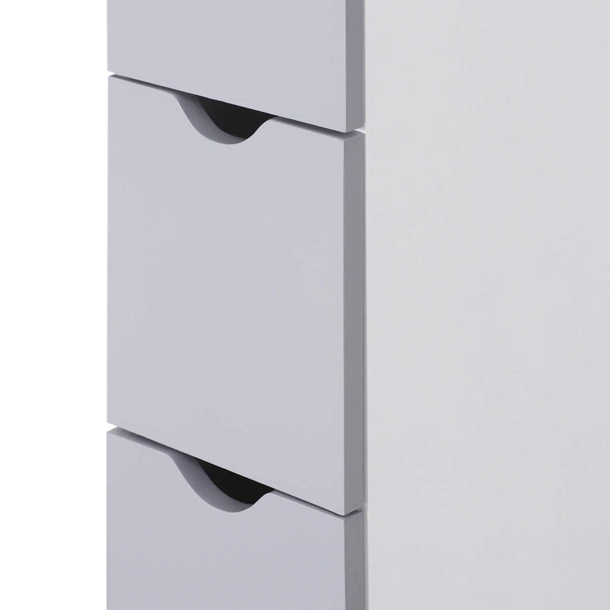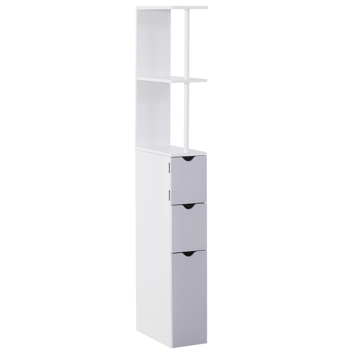 - HOMCOM Bathroom Storage Cupboard Thin Cabinet Unit Shelf White w/ Drawers - Description: - With a tall and slim profile in modern style - Features 2 open shelves and 3 bottom drawers - Ideal for storing towels, toiletries and other bathroom necessities - Can be secured to a wall for added stability - Overall Dimension: 15W x 33D x 136.5H (cm)