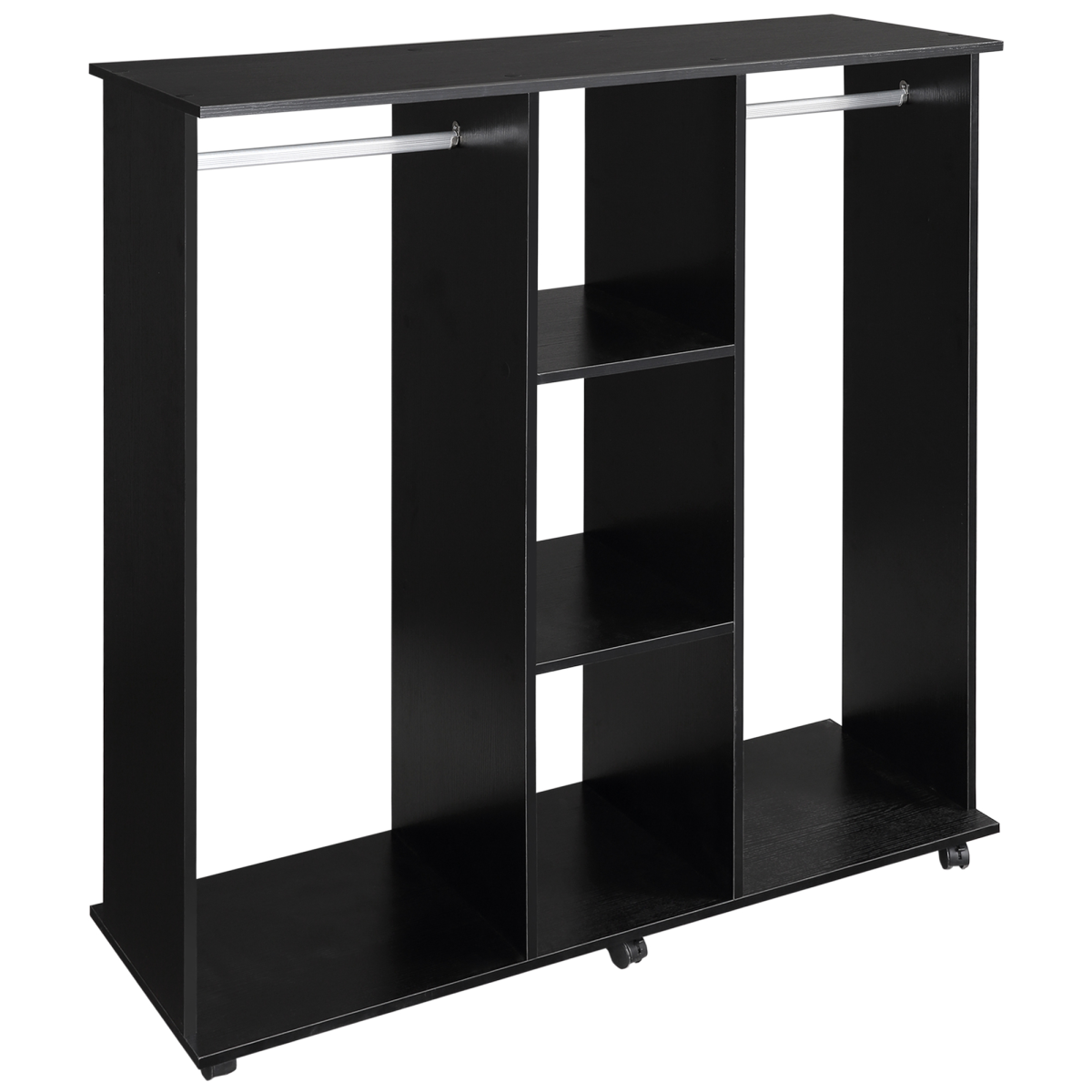 Comes with 2 hanging rails and 3-tier cube for organised storageComplete with 6 omni-directional wheels( 2 with brakes) for easy movementConstructed from durable chipboard and aluminium alloy rails for long term useCoated panels with PVC edge banding for easy maintenanceOverall Dimension: 120L x 40W x 128H cm. Assembly required.