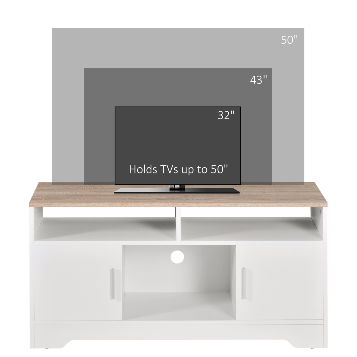 CLEAN, MODERN DESIGN: Boxy shape, in a versatile white colour, with a wood-effect table top. The TV unit looks great in lots of different interior styles.STORAGE: Features three open compartments, two cabinets and a flat table top - this tv stand cabinet has plenty of room for holding a TV, media devices and more.STURDY: Particle board structure is tough and durable, so the TV cabinet is suitable for everyday use. MELAMINE COATING: A smooth finish which offers extra protection.CABLE HOLES: Keeps all wires together to prevent mess and tangling inside the TV table. DIMENSIONS: 52H x 105L x 40Wcm. End cabinet: 27H x 29.5L x 37Dcm.MAXIMUM LOAD 70KG. ASSEMBLY REQUIRED.