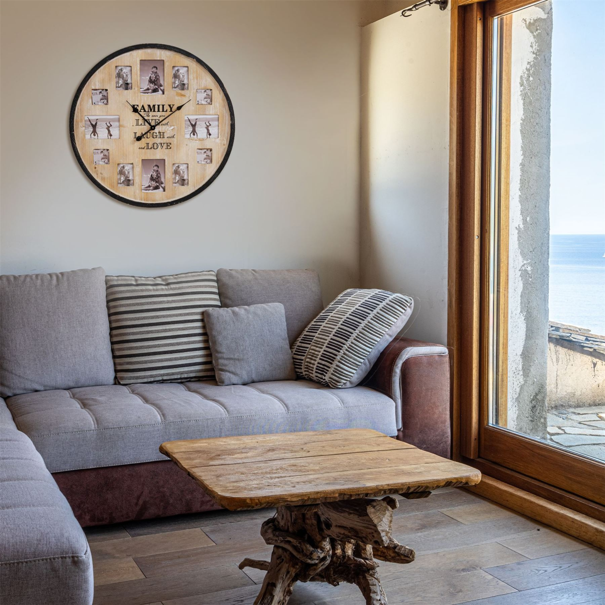 This large rustic statement clock is the perfect addition to any family home. At 80cm in diameter, it would be perfect for a large kitchen or living space. In place of numbers, the dial is made up of twelve apertures for keeping your most treasured pictures. In the centre is the sentiment 'Family, the ones you live with, laugh with, and love.' and it has black spade hands to finish. It requires one AA battery for use.
