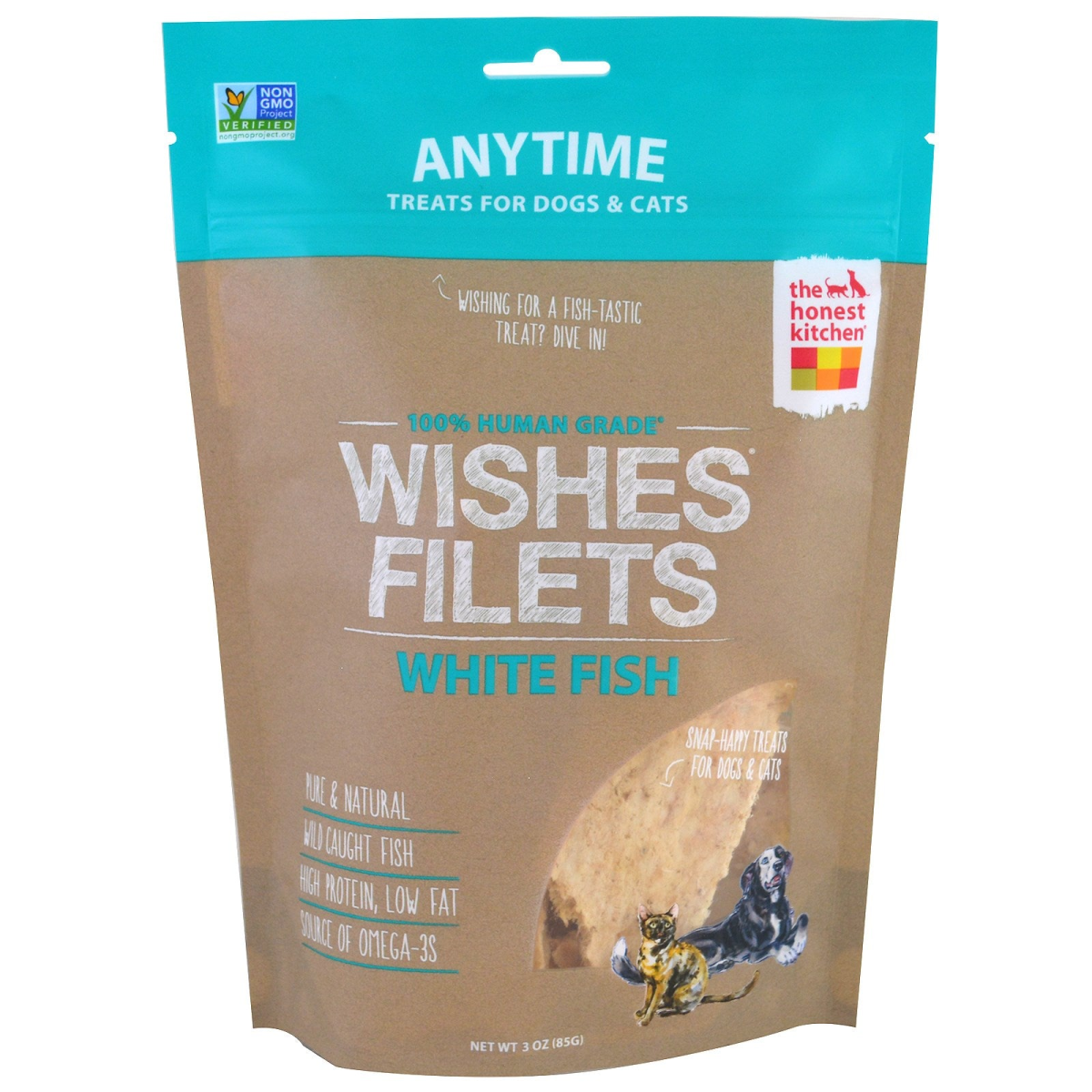 Non-GMO Project Verified Anytime - Treats for Dogs & Cats Wishing For a Fish-Tastic Treat? Dive In! Snap-Happy Treats for Dogs & Cats Pure & Natural Wild Caught Fish High Protein, Low Fat Source of Omega-3s Simple Ingredients. What's the Story? Oh snap! Wishes filets are light, crispy and perfectly snapable so you can use tiny morsels for smaller mouths. Both dogs and cats love the taste, and you'll love that they're made with wild caught fish loaded with protein and Omega-3s. Plus, they're verified non-GMO, 100% human grade and contain absolutely no preservatives or fillers. See...wishes do come true! Guaranteed Analysis Crude proteinmin84.0% Crude fatmin2.4% Crude fibermax1.0% Moisturemax12.0% Omega-3 Fatty Acids**min1.0% Calories Content (Calculated) M.E. 3700 kcal per kg / 28 kcal per average half filet. **Not recognized as an essential nutrient by the AAFCO dog and cat food nutrient profiles. There are only so many fish in the sea! We use a variety of sustainable, wild caught white fish for Wishes to help maintain a healthy ecosystem in the ocean.