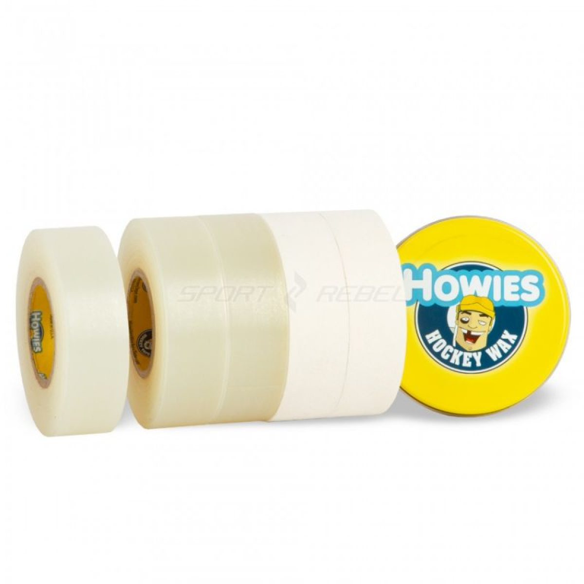 Howies Hockey Tape, Shin Guard Tape, and Wax Pack. Each pack contains: 3 rolls of clear shin guard tape, 2 rolls of stick tape, and 1 can of wax. Features: Clear shin guard tape is flexible, strong, and doesn't leave marks on your socks. The wax prevents snow and ice buildup for improved feel and control. This white/black stick tape is a premium Howies product.
