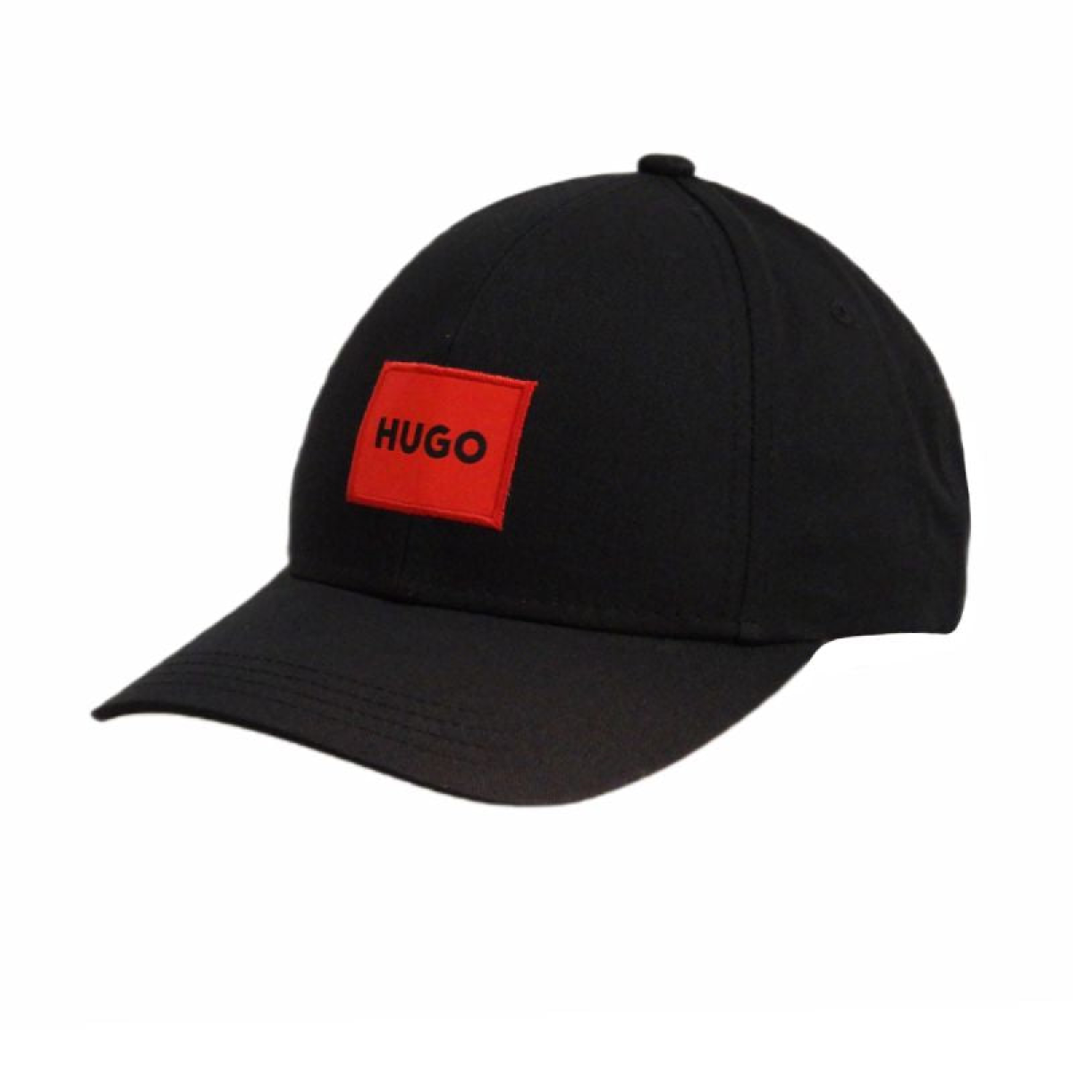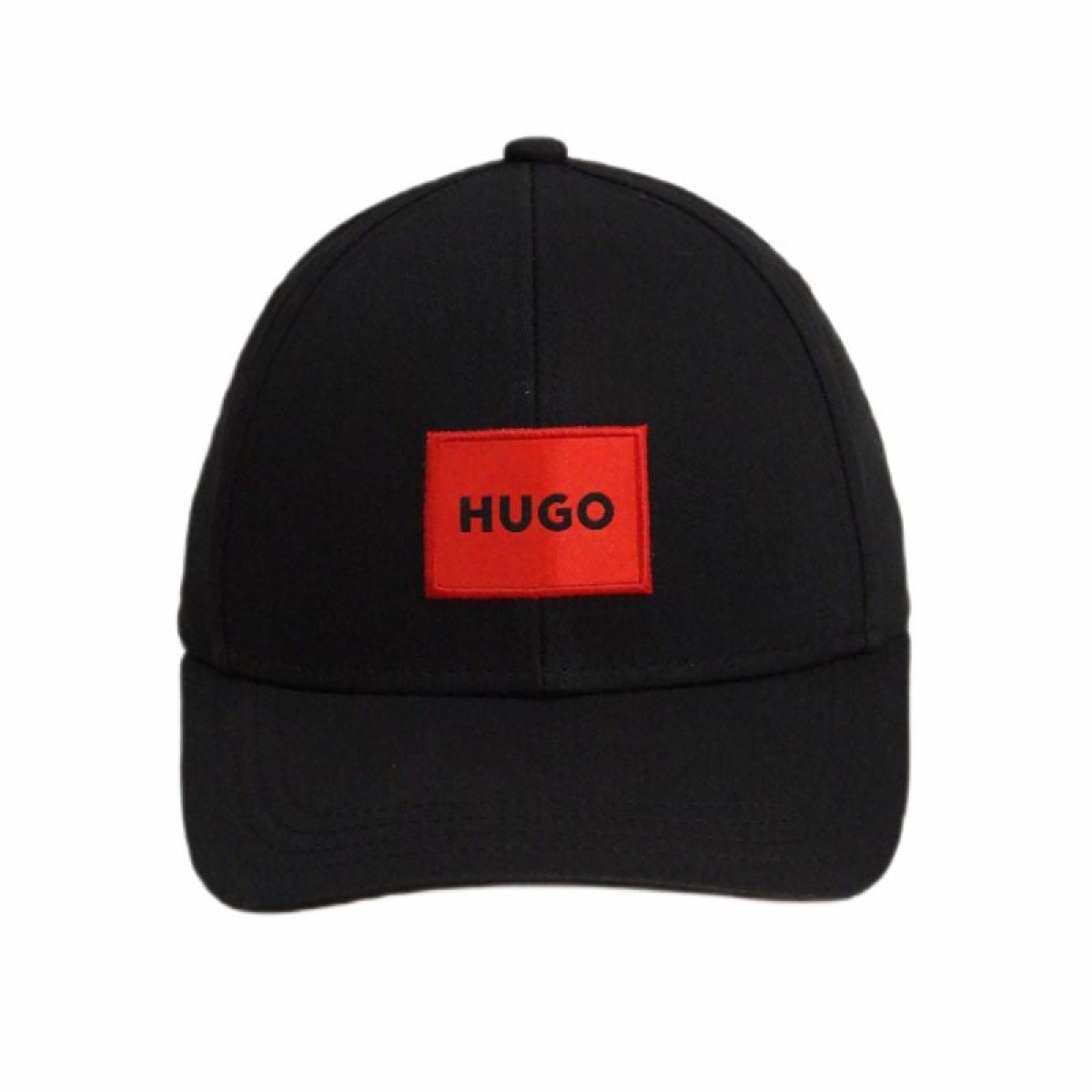 The baseball cap is entirely black with a red patch with the HUGO brand logo.