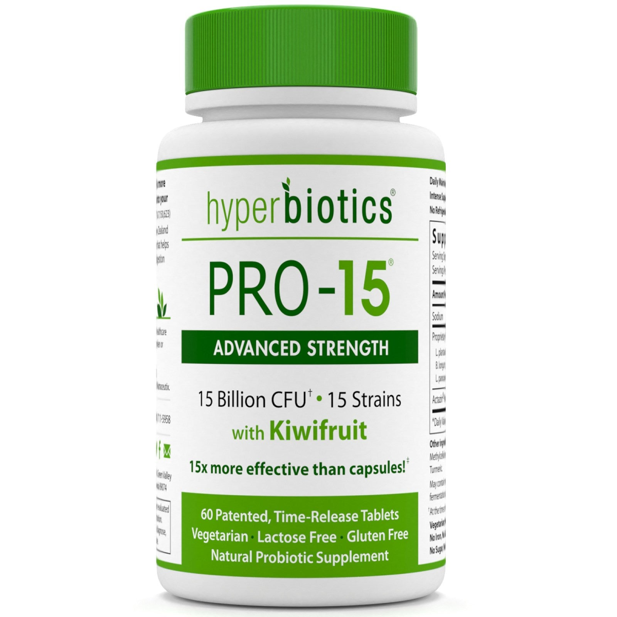 15 Billion CFU†15 Strains 15x More Effective than Capsules! Vegetarian Lactose Free Gluten Free Natural Probiotic Supplement With patented technology, PRO-15 is 15x more effective than capsules, reaching deep into your intestinal tract alive. Kiwifruit powder, comprised entirely of the New Zealand kiwifruit, is a whole food, superfruit ingredient that helps your probiotics colonize, supports improved digestion and promotes regularity. †At the time of manufacture. Minimum of 5 Billion CFU at expiration.