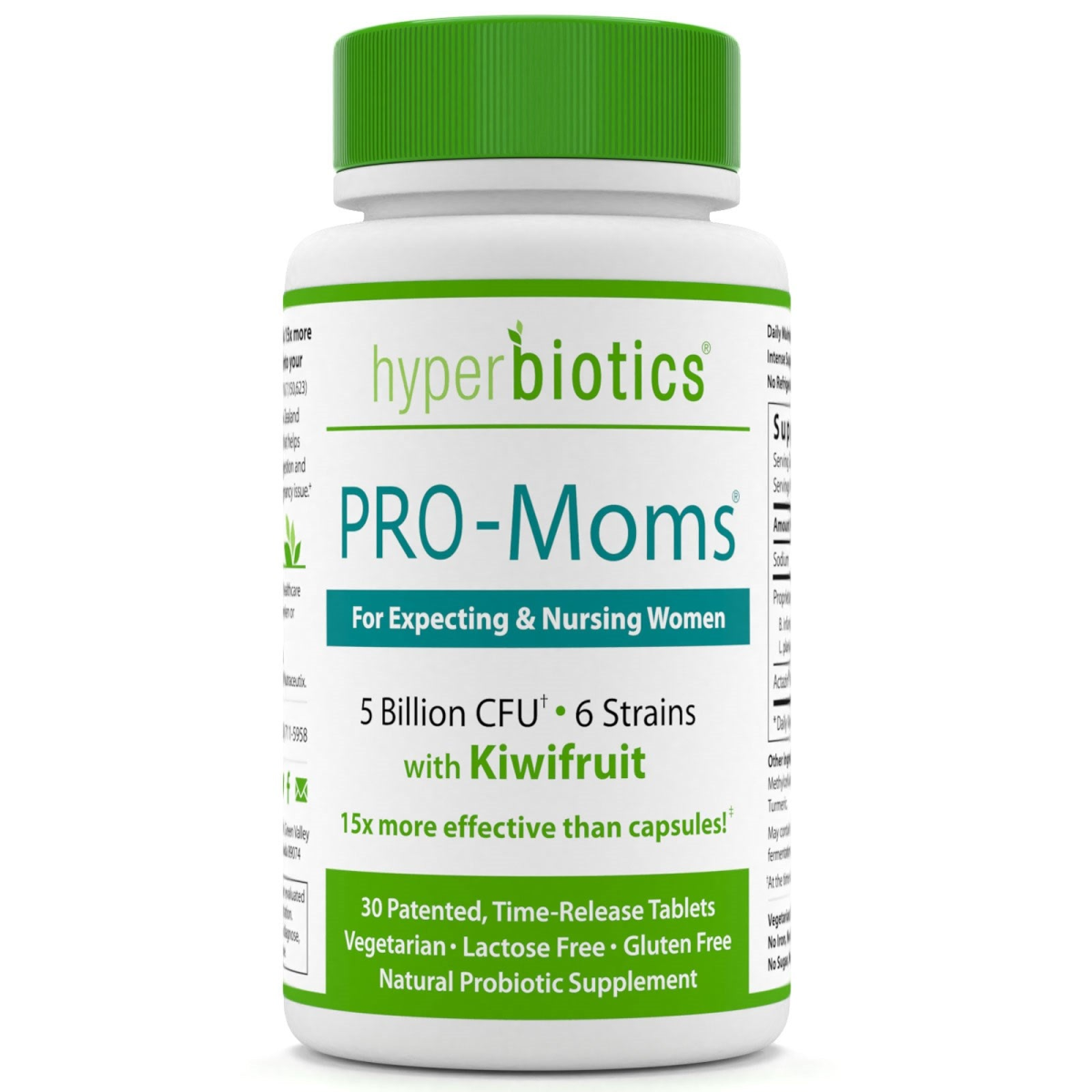 For Expecting & Nursing Women 5 Billion CFU - 6 Strains 15x More Effective than Capsules! 30 Patented, Time Release Tablets Vegetarian Lactose Free Gluten Free Natural Probiotic Supplement With patented technology, Pro-Mom is 15 x more effective than capsules, reaching deep into your intestinal tract alive. (US patent No. 8,007,777 & 7,150,623) Kiwifruit powder, comprised entirely of the New Zealand kiwifruit, is a whole food, superfruit ingredient that helps your probiotics colonized, supports improved digestion and reduces occasional constipation, a common pregnancy issue.