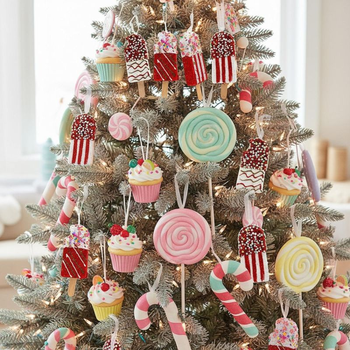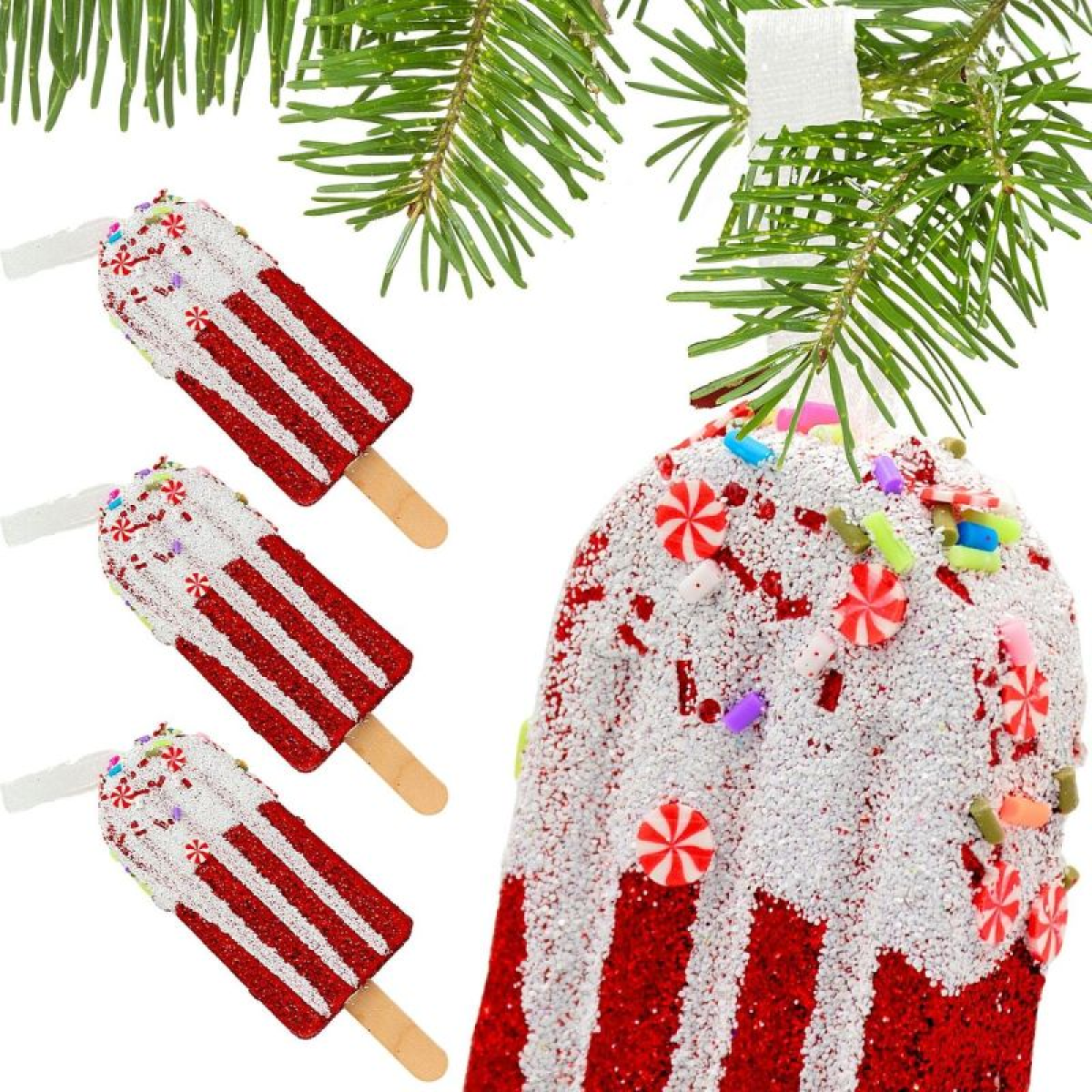 Want to add a touch of fun and sweetness to your holiday decor? Choose this set of 3 ice cream-shaped hanging decorations. Sparkling, glittery, and adorned with colorful details, these pendants look like sweet lollipops and are perfect for Christmas trees, garlands, wreaths, or as part of winter arrangements.