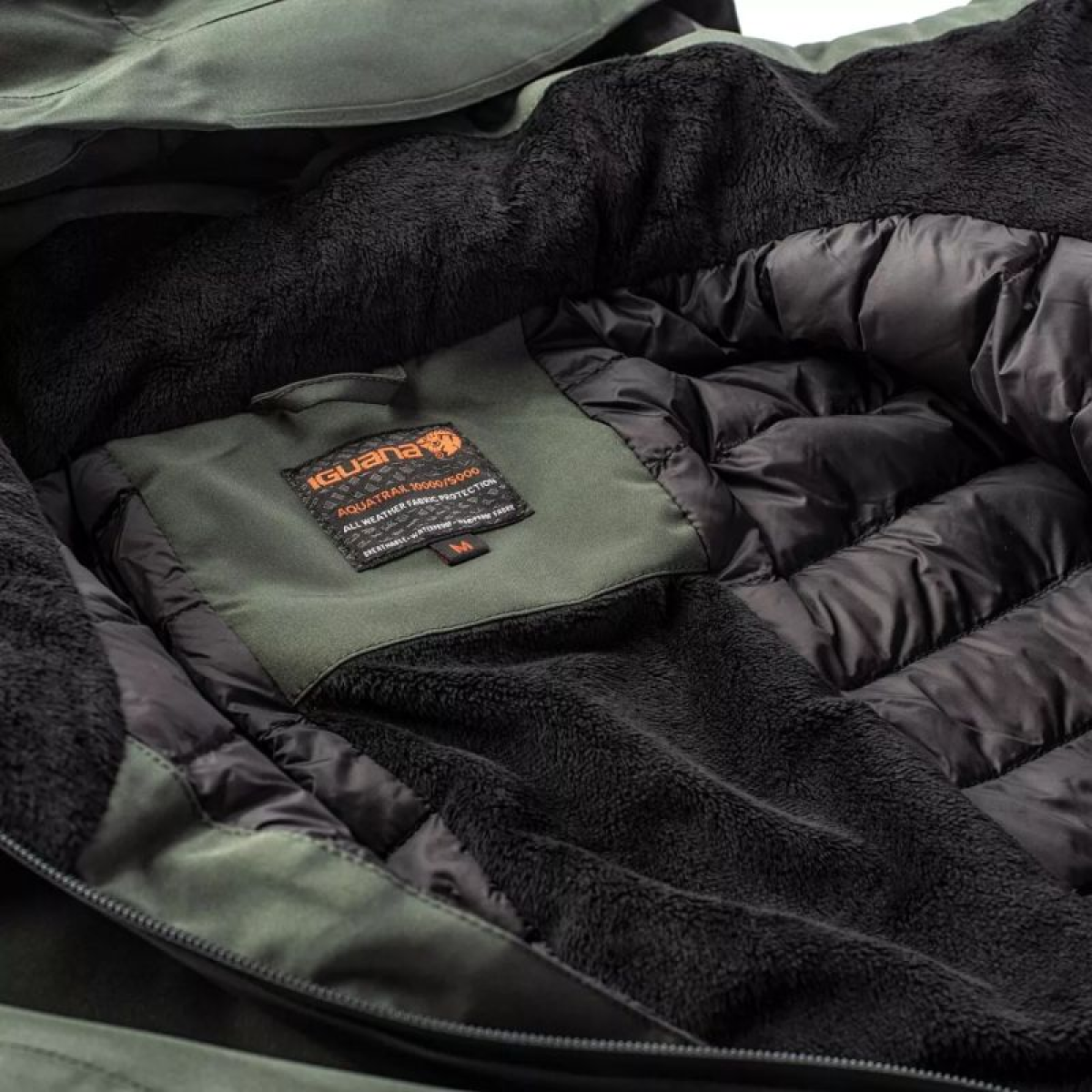 Men's LOTHO winter jacket by Iguana. Provides protection against snow and rain thanks to the use of a 10,000 mm H²O waterproof membrane. The jacket is equipped with side pockets and a ski pass pocket. The zipper with a high stand-up collar is finished with a flap that protects the chin. Additionally, the LOTHO jacket is equipped with a side-adjustable hood. An anti-snow apron that works perfectly during heavy rainfall and possible falls in the snow. DWR coating is a type of special impregnation of fabric that increases the surface tension of water, its main task is to ensure a high degree of water resistance. The jacket is made of durable polyester and will ensure a long period of use. The duck down and feather filling does a great job of keeping the user warm. The whole thing has been secured with taped seams to prevent unraveling and additionally seal the jacket.