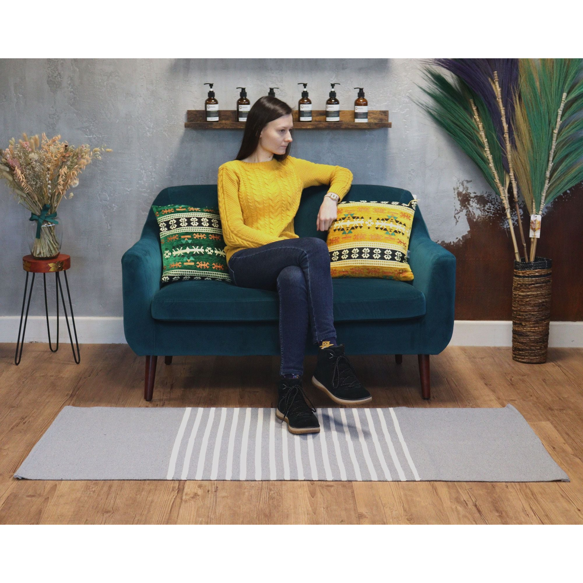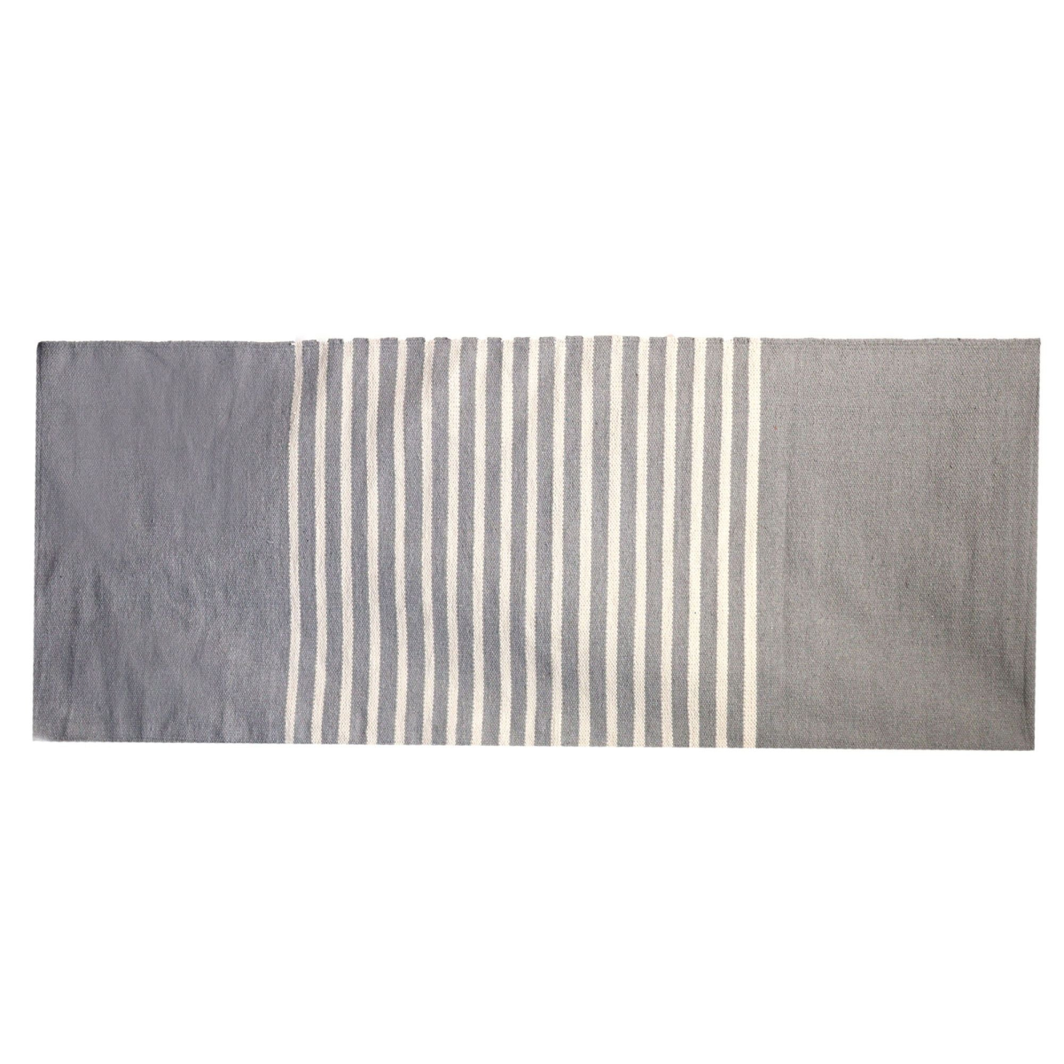 Yoga mat sized grey Indian Cotton Rug is ideal for halls, bathrooms, home décor or yoga. Made with 100% Indian cotton by a family business in Panipat. This small city, north of Delhi is known of weavers and famous for its hand crafted textiles.