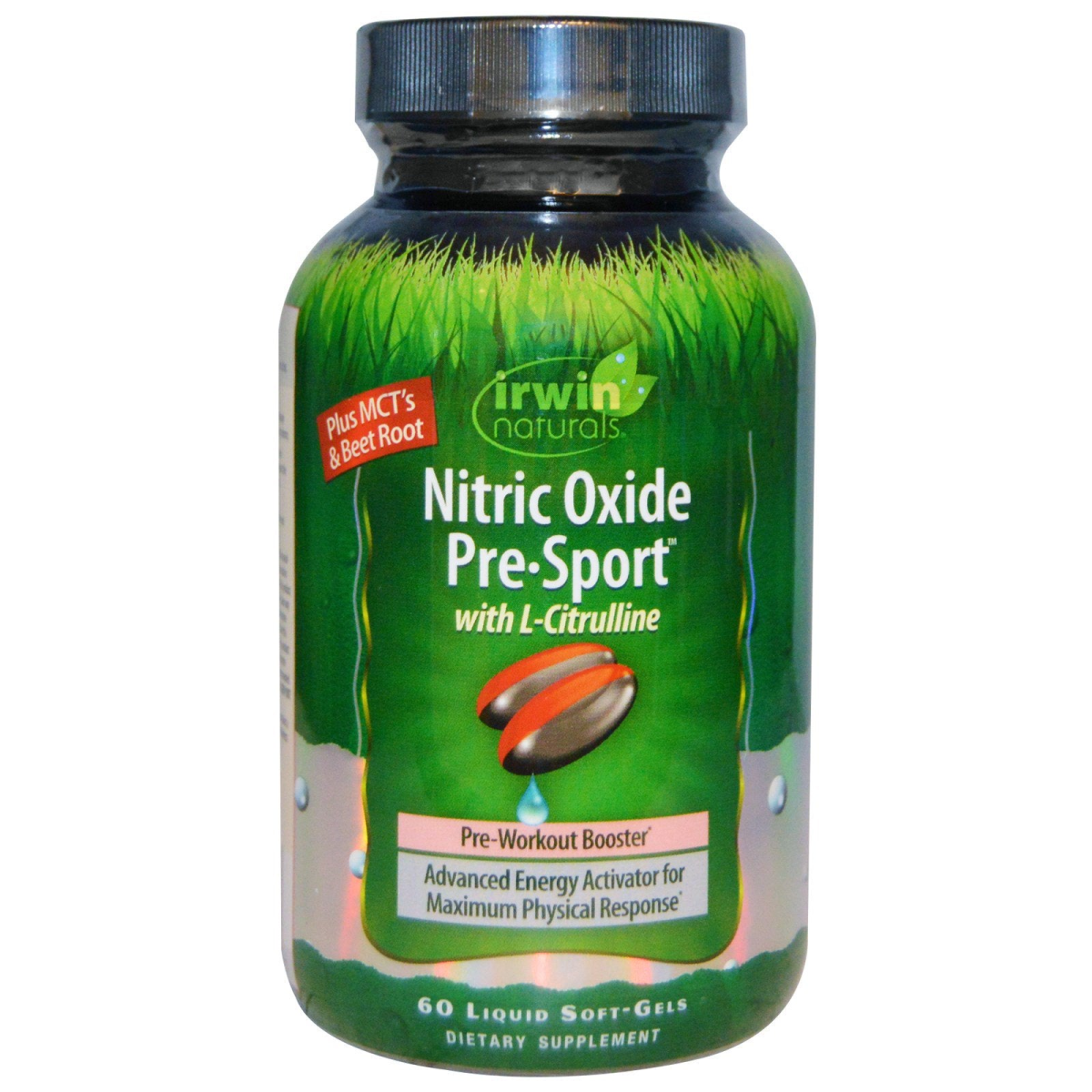 Plus MCT's & Beet Root With L-Citrulline Pre-Workout Booster Advanced Energy Activator for Maximum Physical Response Dietary Supplement Nitric Oxide Pre-Sport - is designed to help you maximize performance when you workout or participate in any sporting activity. When it comes to performance, Nitric Oxide is key. Nitric Oxide is a naturally-occurring compound in the body that plays a key role in cardiovascular health. Nitric Oxide is produced in the inner lining of blood vessels and helps to relax and dilate vessels, allowing more blood to flow throughout the body. This unique formula features L-Citrulline, an amino acid that is readily converted to L-Arginine, which can then be converted into Nitric Oxide within the body. This powerful formula also includes Medium Chain Triglycerides (MCT’s). MCT’s are a preferred source of quick cellular energy. They are rapidly absorbed into the bloodstream and immediately converted into energy at the cellular level. Nitric Oxide Pre-Sport also contains Yerba Maté and Ginseng, specialized ingredients traditionally used to help increase the feeling of energy and Ginkgo traditionally used to support blood circulation. This product can be taken an hour before engaging in any sporting activity or can be taken daily for ongoing maintenance. What Makes Us Different: Liquid Soft-Gels - The Nutrients in these easy-to-swallow Liquid Soft-Gels are released fast. Quality Assurance - Irwin Naturals' is committed to providing the highest quality products for your health. We employ compliance testing to ensure purity and potency. Patented BioPerine - BioPerine enhances the bioavailability, absorption and potency of many nutrients.