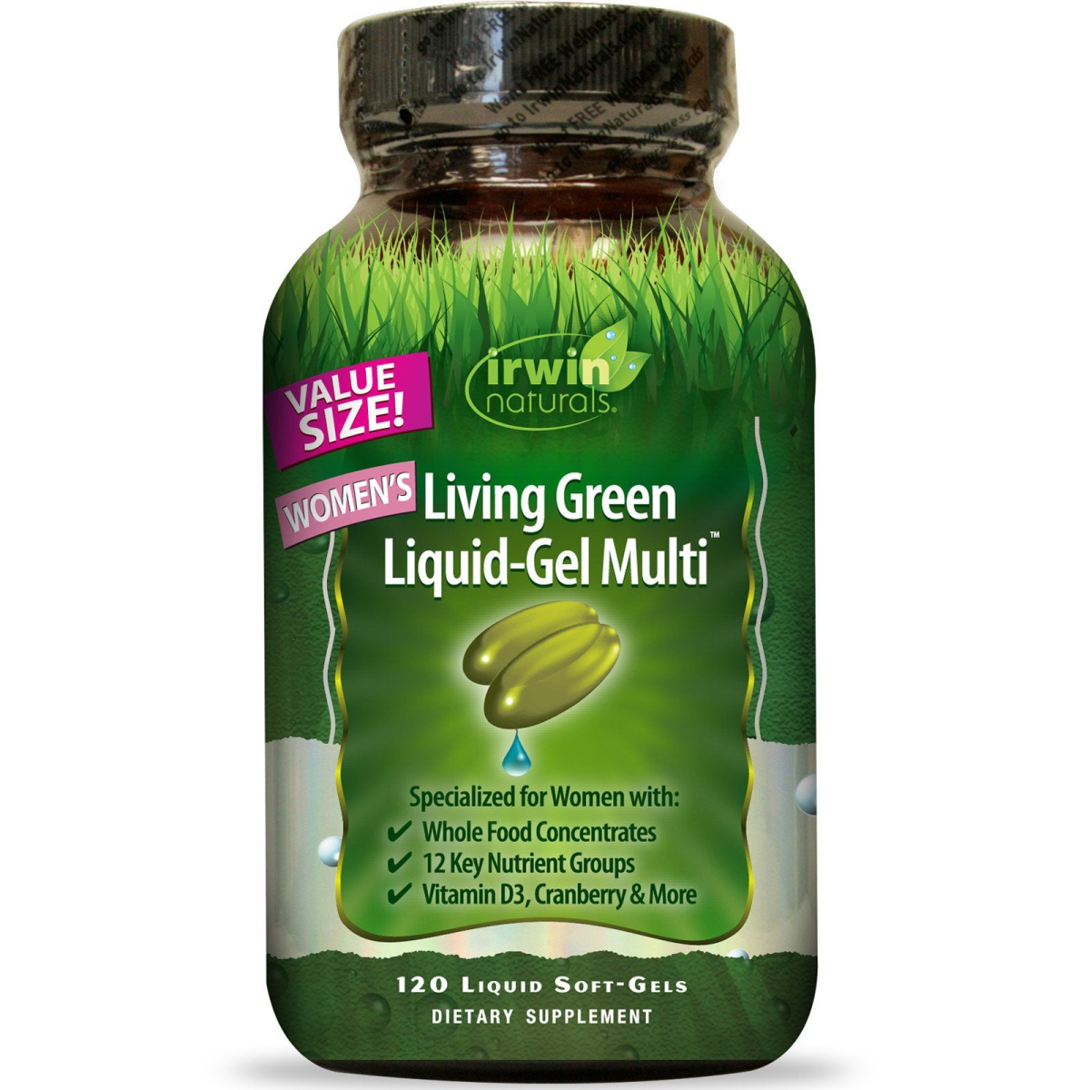 Value Size! Dietary Supplement Specialized for women with: Whole food concentrates 12 key nutrient groups Vitamin D3, cranberry & more Women's Living Green Liquid-Gel Multi sets a new standard in today's world of low nutrition and high stress. Using powerful botanicals from whole living plants, this is not a one-size-fits-all formula....it's targeted to benefit the unique nutritional profile of women. For example, it delivers Vitamin D3, Evening Primrose Oil and Cranberry. But most importantly, it's one of the world's first multi-nutrition formulas that is delivered in a liquid soft-gel. So what does that mean to you? The nutrients in soft-gels are quickly released for use in your body, they're easier to swallow and they do not contain binders and fillers found in tablets, so there's more room for life-giving nutrients. But the greatest benefit of soft-gels is that they can hold special oils, such as Omega-3 essential fatty acids (EFAs). This breakthrough formula combines over 70 nutrients, vitamins and minerals that cover the following 12 categories: One: Full-Spectrum Vitamins Two: Minerals Three: Crucial Oils Complex Four: Antioxidant Blend Five: Fruit and Vegetable Blend Six: Immuno Blend Seven: Amino Acid Blend Eight: Traditional Botanical Blend Nine: Green Super Food Blend Ten: Adrenal Blend Eleven: Brain Blend Twelve: Targeted Blend
