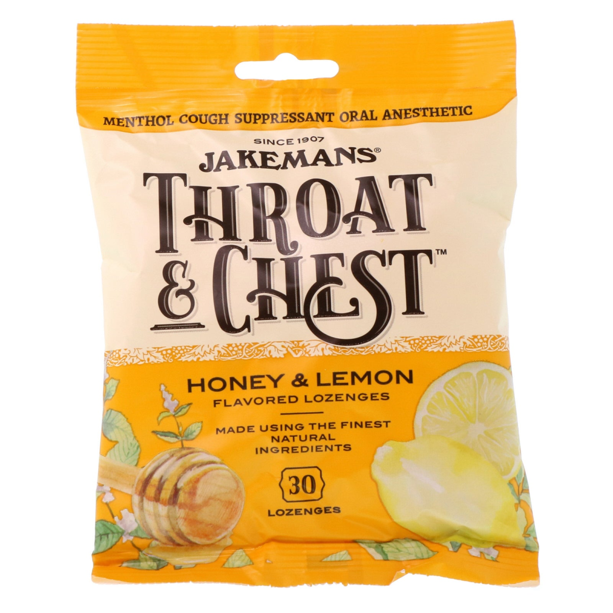 Boston England EST 1907 With Other Natural Flavor Menthol Cough Suppressant Oral Anesthetic Made in Boston, England, for over 100 years using the finest natural ingredients. Jakemans famous and original Throat & Chest Lozenges are made with the finest natural ingredients, carefully blended with soothing menthol to obtain a unique mouth watering and refreshing taste. Once tasted they will be your favorite soothing lozenge! Uses Temporarily relieves: Cough due to minor throat and bronchial irritation occurring with the common cold or inhaled irritants. Occasional minor irritation, pain, sore mouth, and sore throat.