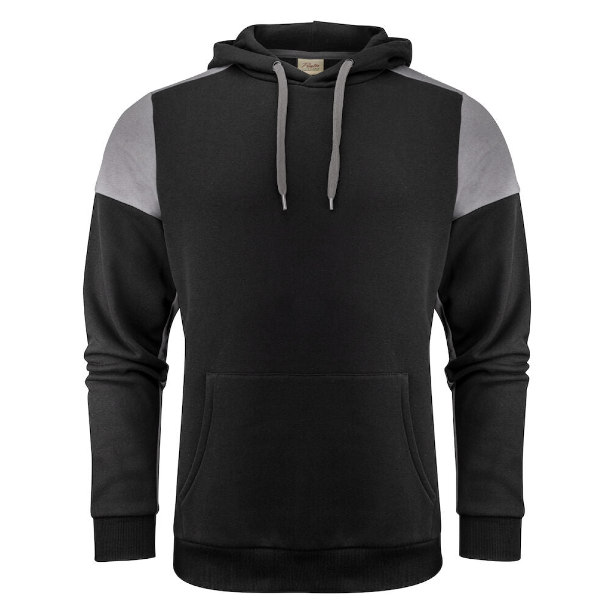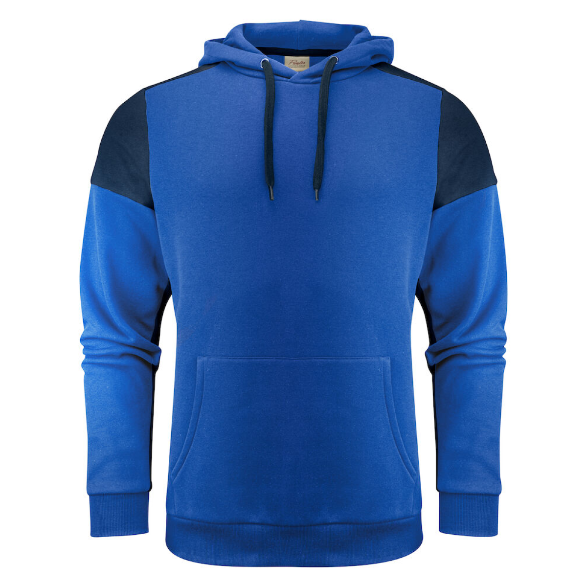This modern activewear hooded jumper has a thoughtful two-colour design with contrast colour on the shoulders and sleeves, contrast tape on the neck and a contrast draestring in the hood.