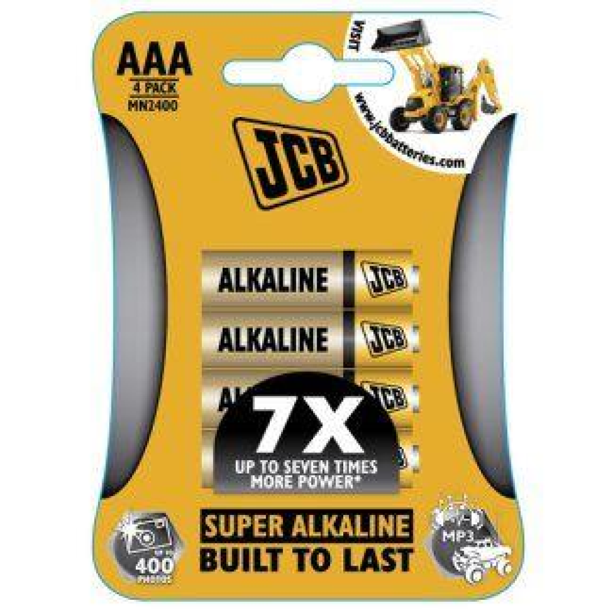 The JCB AAA 1.5v battery is the smaller companion of the AA battery.Pack of 4 alkaline AAA. Also known as MN2400, LR03/E92, 4003, KAAA, AM4. Dimensions: Height 44.5mm Diameter 10.5mm. S5337.