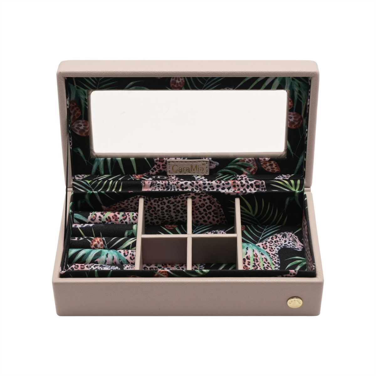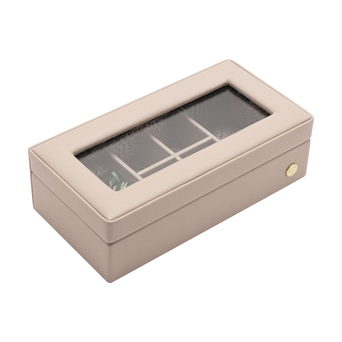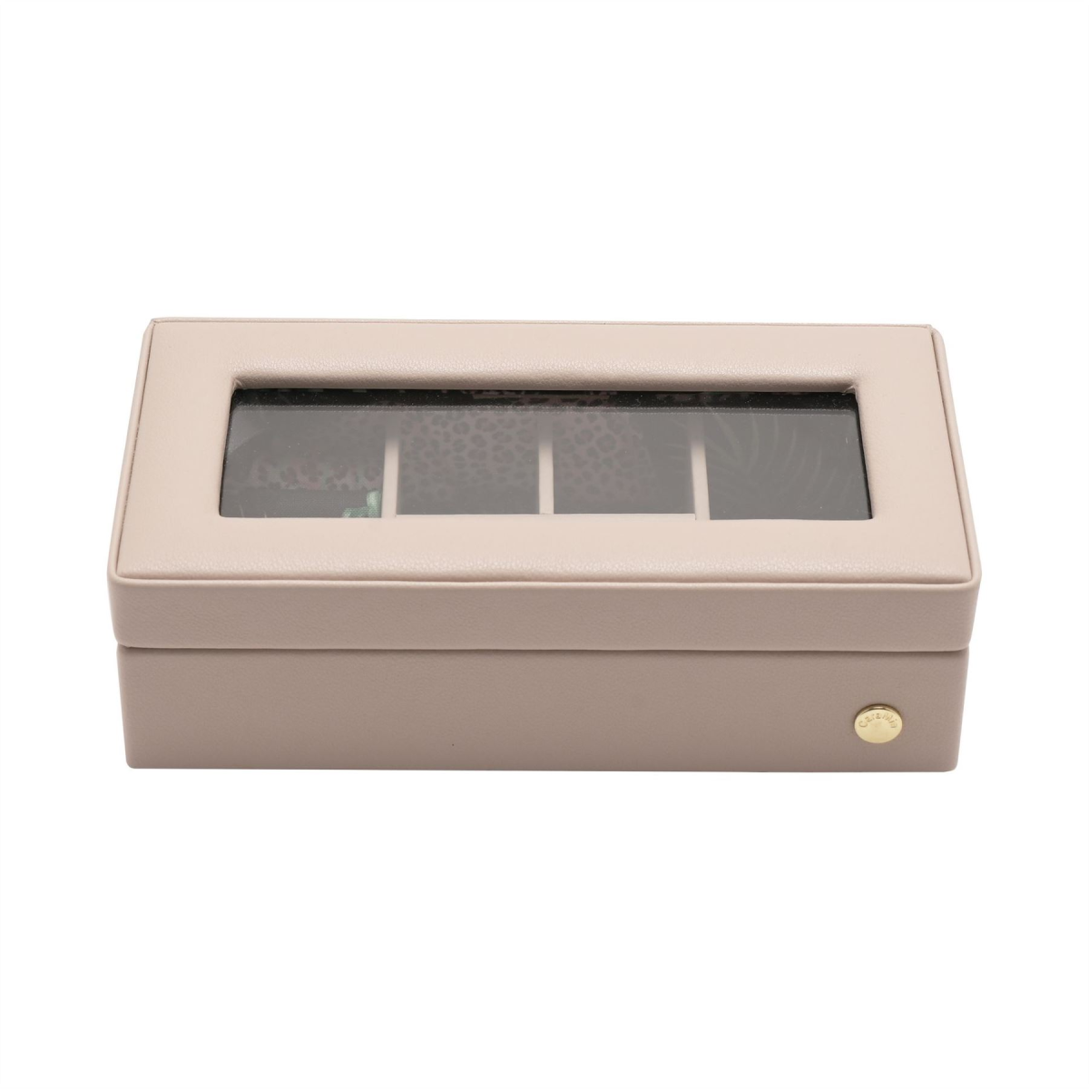 The eye-catching case is made from grey leatherette, opening to reveal a beautifully decorated storage area with tailor-made compartments for displaying rings, earrings and other jewellery pieces. It is finished with a glass display window within its hinged lid.