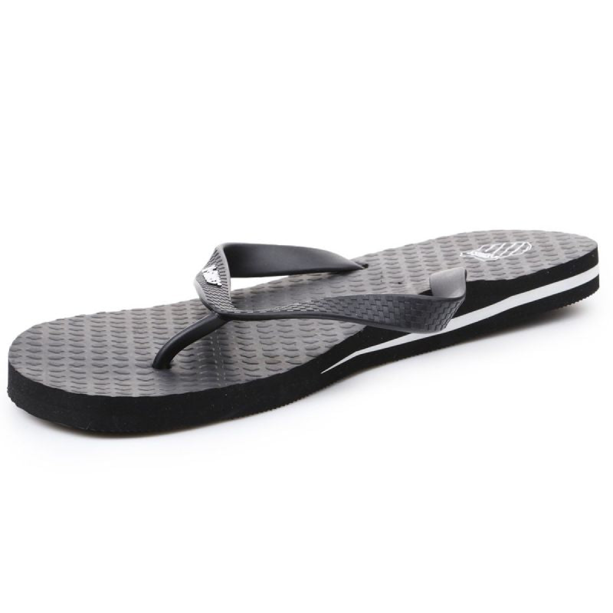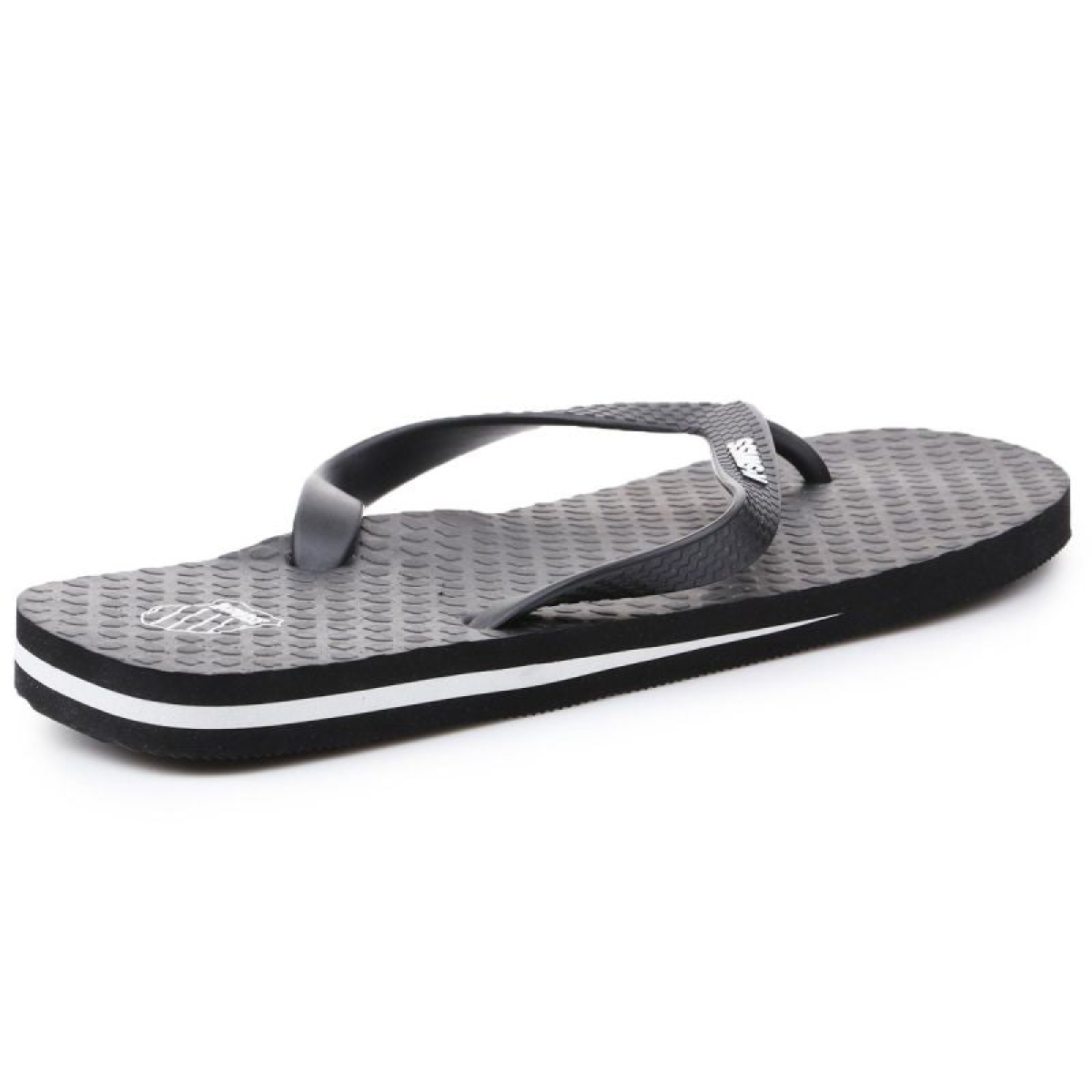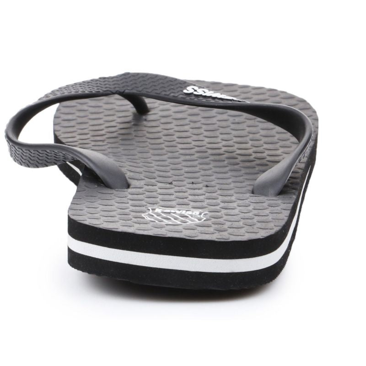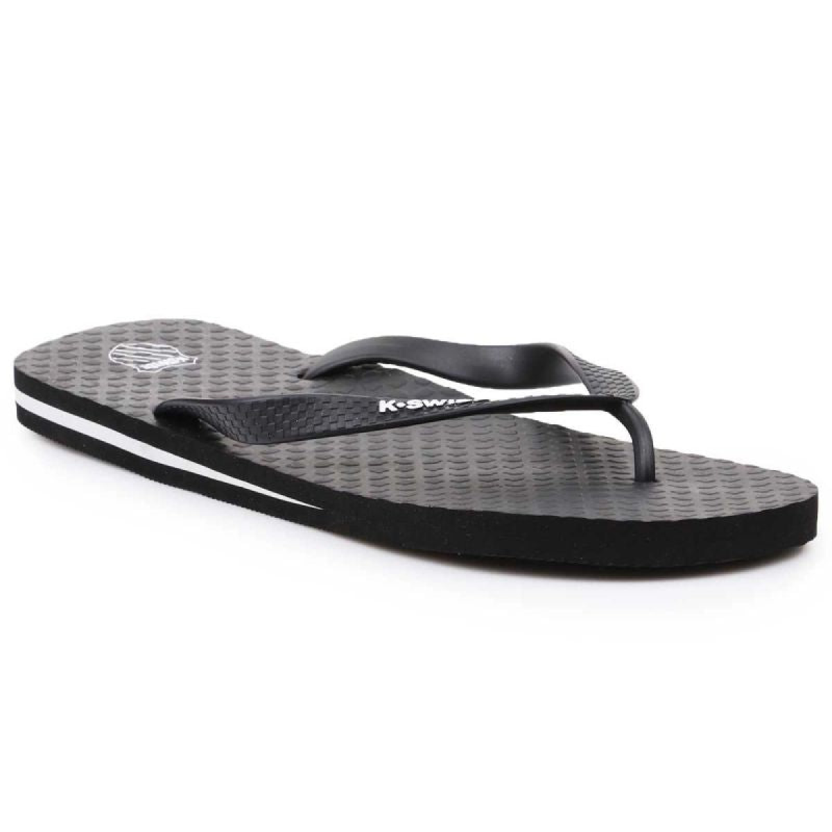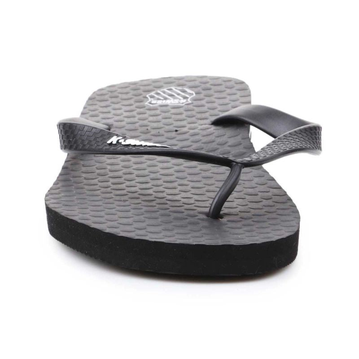 Men's flip-flops from K-Swiss. Perfect for the shower, pool, beach, or around the house. The white K-Swiss logo contrasts with the dark upper. A white stripe around the upper.