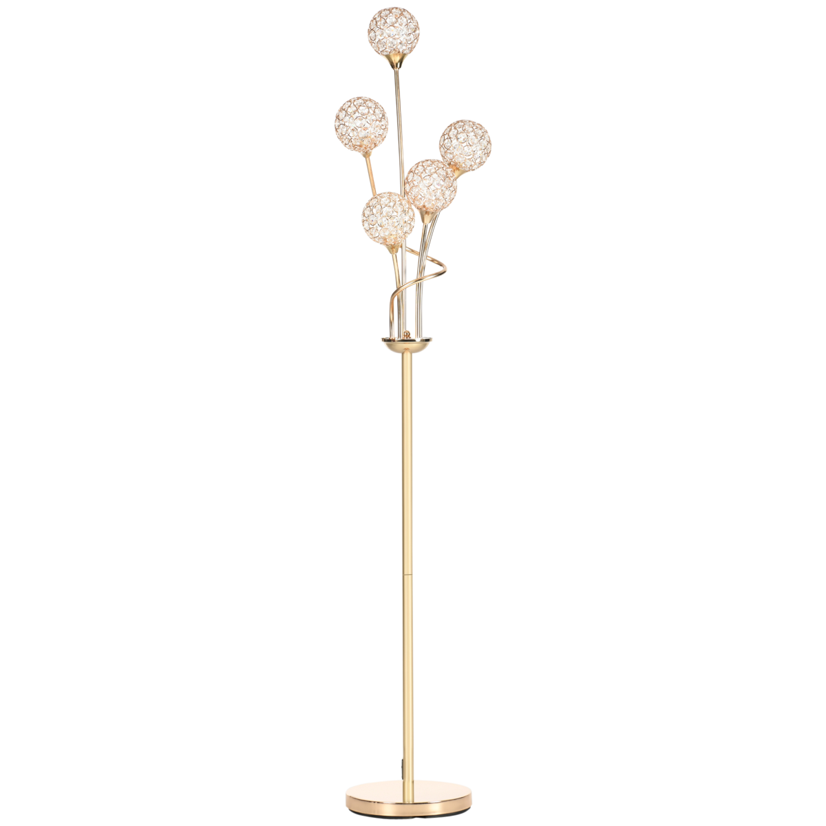 Five crystallite shades: A beautiful, sparkling upright floor lamp. Rounded shades, filled with beads which glisten when the lights are on.Metal frame: A strong and sturdy core for this tall lamp. Rounded base for balance.Foot switch: Easy to turn this standing lamp on and off - without even having to use hands. Long power cable to stretch across longer distances.Five bulbs required, not included: Living room lamp takes G9 bulbs, maximum 25W. Halogen and LED are suitable.Dimensions: 156H x 34W x 25Dcm. Easy to assemble.