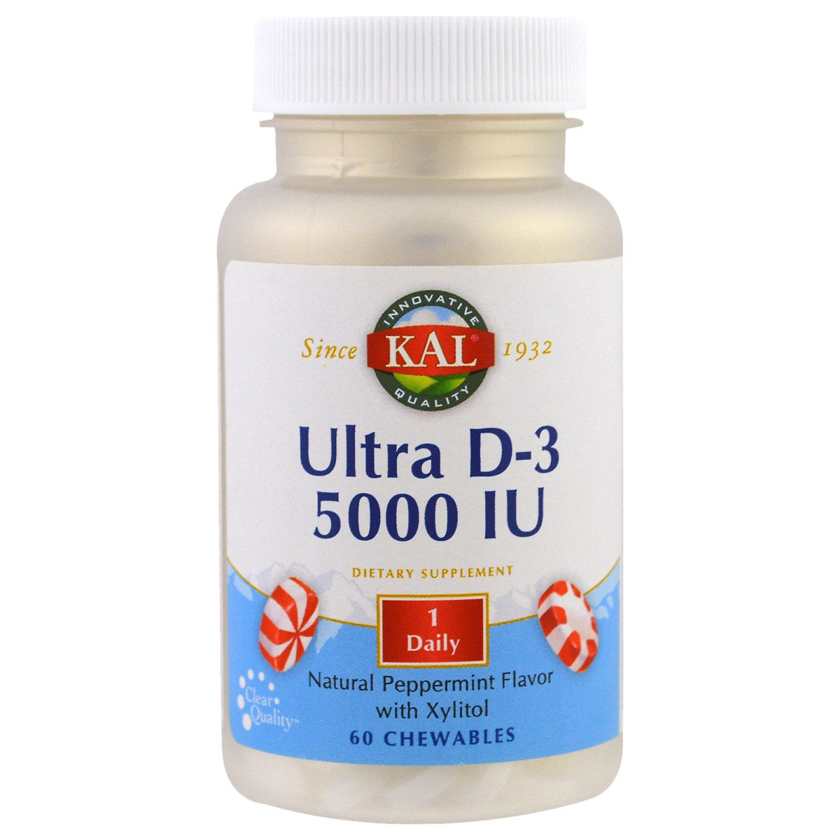 Innovative Quality Since 1932 Dietary Supplement Clear Quality Discussions: KAL Ultra D-3 is high potency formula providing 5,000 IU of natural Vitamin D-3 per sugarless chewable. Vitamin D is essential for the proper formation of the skeleton and for mineral homeostasis. Supplementation may be helpful for those with limited exposure to sunlight. Each chewable is a delicious natural peppermint flavor.