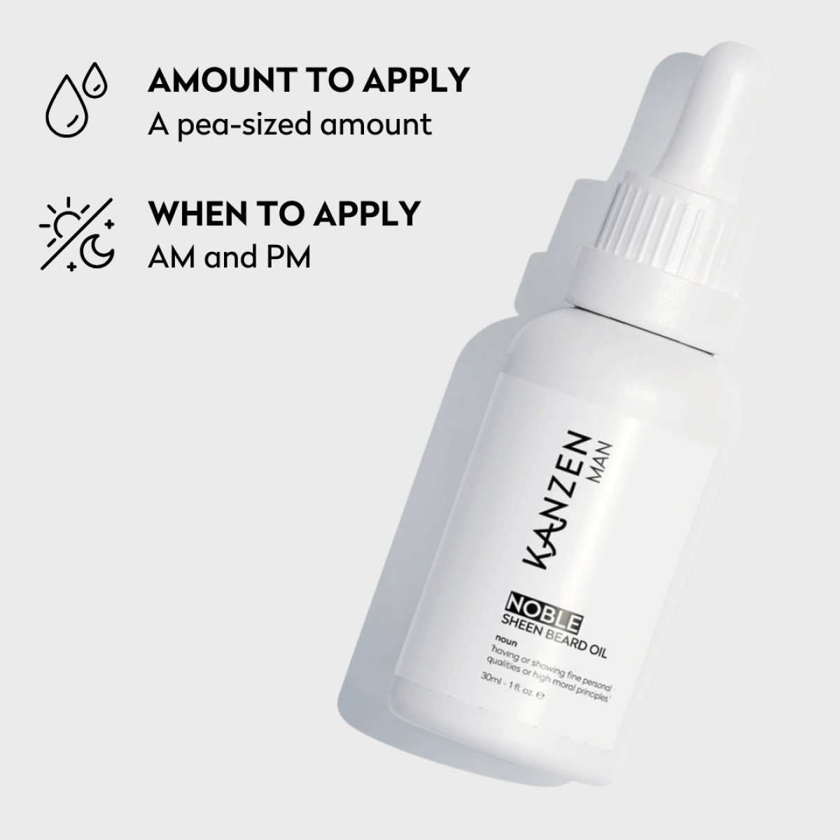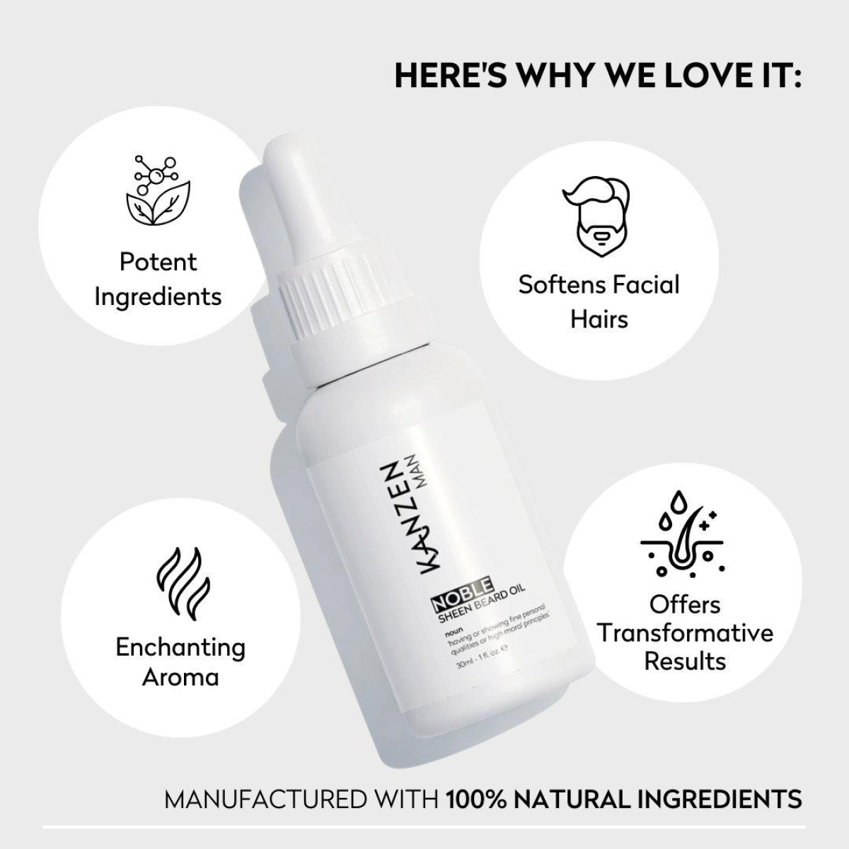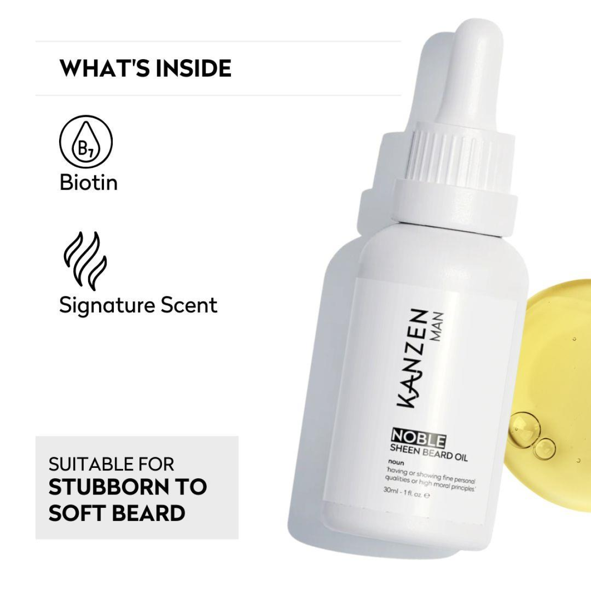 Elevate your grooming with Kanzen Man’s Noble Sheen Beard Oil, crafted for the modern gentleman. This luxurious oil softens, tames, and nourishes your beard, even the most rebellious strands. Infused with Biotin, it strengthens hair follicles, promoting a healthy, vibrant beard. With its signature scent, Noble Sheen leaves a lasting impression, adding sophistication to your routine. Suitable for all beard types, it enhances appearance while promoting overall beard health. Indulge in luxury and refinement—because your beard deserves the best.