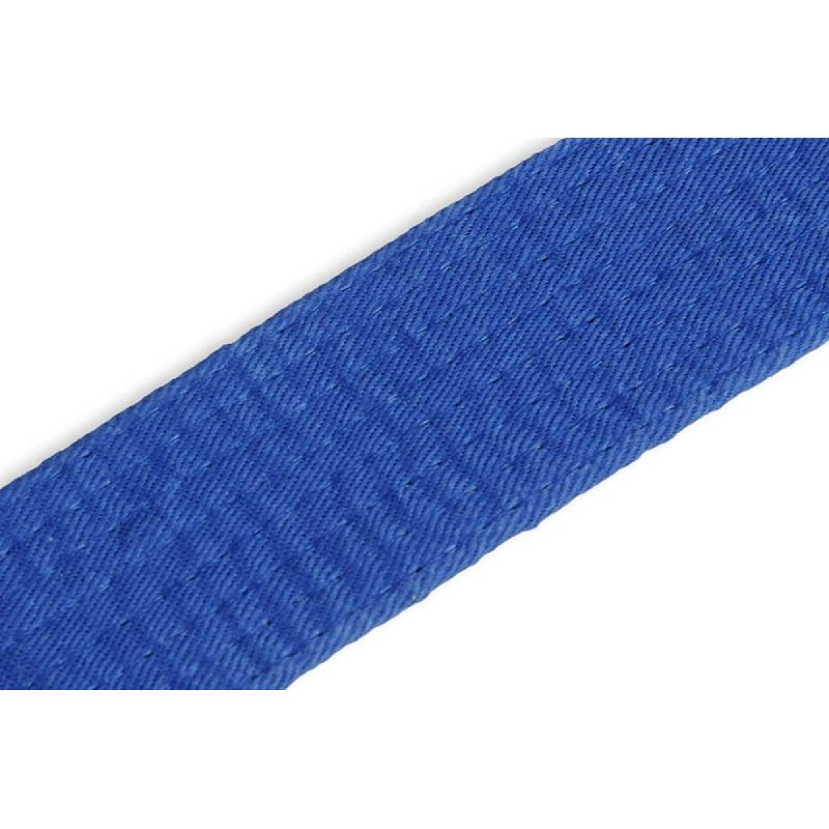 Blue belt for combat sports kimonos, made of a material blend of polyester and cotton, providing resistance to abrasion and tearing.