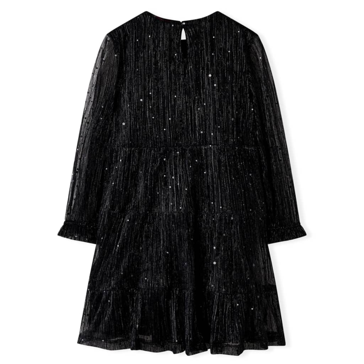 Our children's clothing line is all about affordable, high-quality, and durable everyday wear for kids aged 1.5 to 10. Our range includes jackets, sweaters, shirts, and many more, with a variety in style, size, and colour. Following the high-quality standard in the market, we are using high-grade materials and advanced manufacturing techniques. This kids' dress has long sleeves, a round neckline, and a keyhole opening with a button at the back of the neck. This black children's dress has a floaty tulle design with sequins. The kids' short dress is made from soft material that includes cotton lining, and a polyester shell for comfort and breathability. Good to know: This size chart in the picture provides measurements for kids aged 1.5 to 10, covering the height, chest, waist, and hip. You can easily find the right fit for your child.