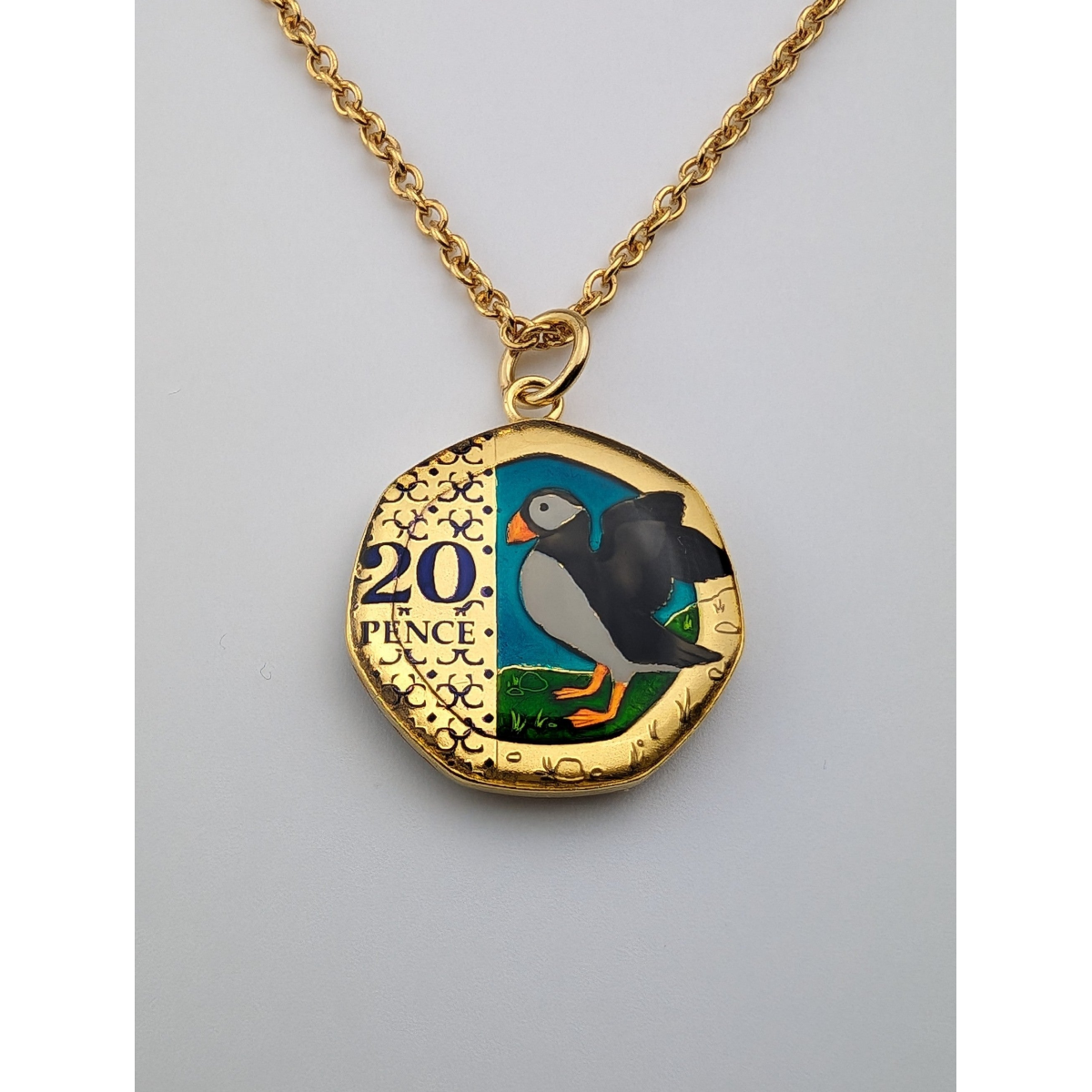This necklace has been made using a King Charles III Twenty Pence. The design features a puffin.