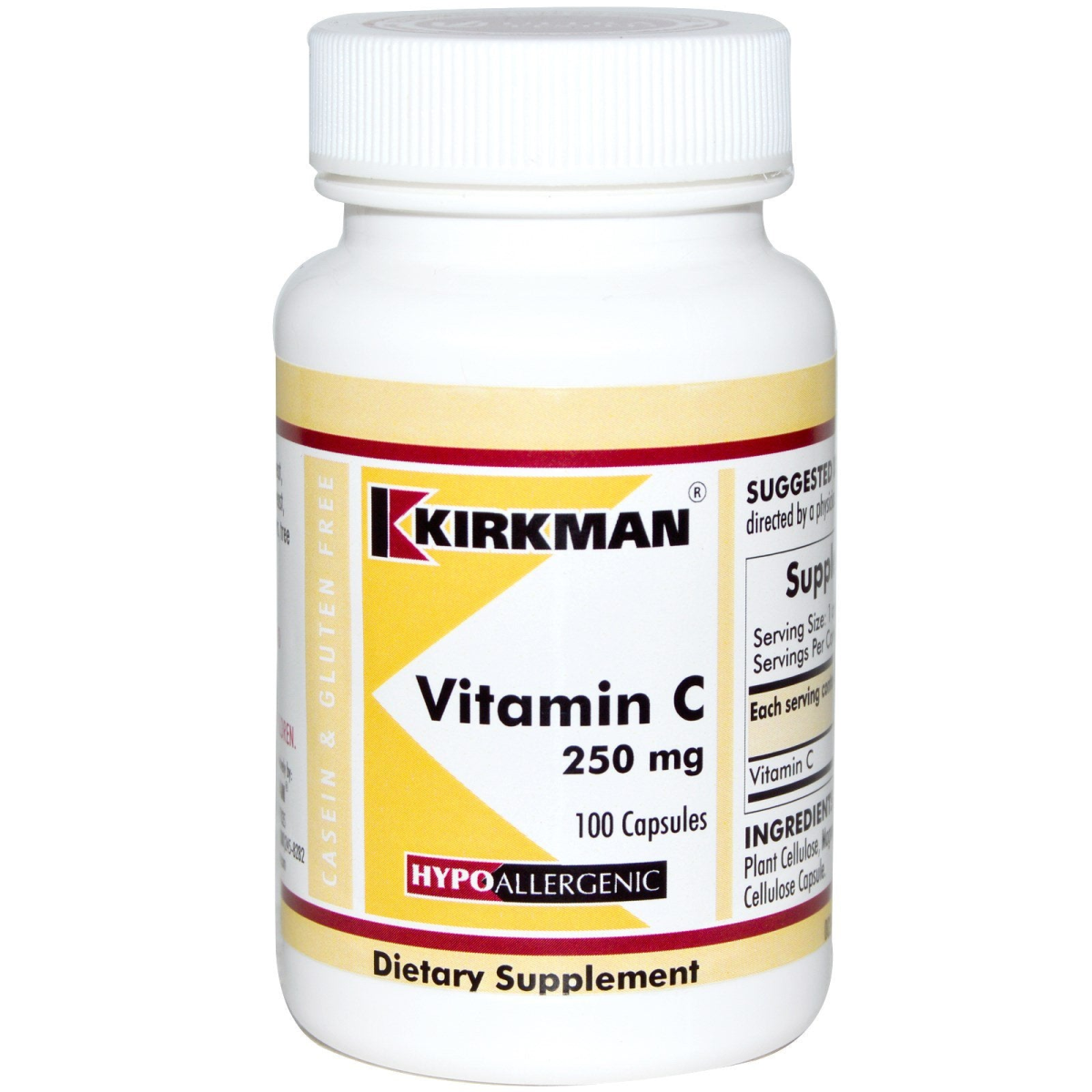 Ultra Tested Tested for Than 950 Contaminants! Heavy Metals- Bacteria- Yeast- Mold- Pesticides & More Casein & Gluten Free Hypoallergenic Dietary Supplement Kirkman's Vitamin C 250 mg. hypoallergenic capsules have a plant cellulose shell with vegetable grade magnesium stearate as a lubricant. No fillers, flavors or other potential allergens are present. The vitamin C in this product is derived from ascorbic acid and sodium ascorbate. By using this combination, the extreme acidity of pure ascorbic acid is neutralized by the sodium ascorbate; this produces a buffering effect that is easier on the digestive tract than straight ascorbic acid. The list of health conditions for which vitamin C has shown promise is very long. Its value in the good health of children is extremely important for the following reasons: Vitamin C supports the immune system by assisting white blood cell function, including antibody levels and responses. Vitamin C is a powerful antioxidant and that can eliminate free radicals that can damage tissues, organs and cells. Vitamin C is essential in the production of collagen. Collagen is the main protein substance in the human body. It holds the body together in the form of tissue, tendons, cartilage, etc. Vitamin C's role in immune system support is one of the key elements that make it very critical for supplementation in children. It is imperative that growing, active children not be deficient in this nutrient.