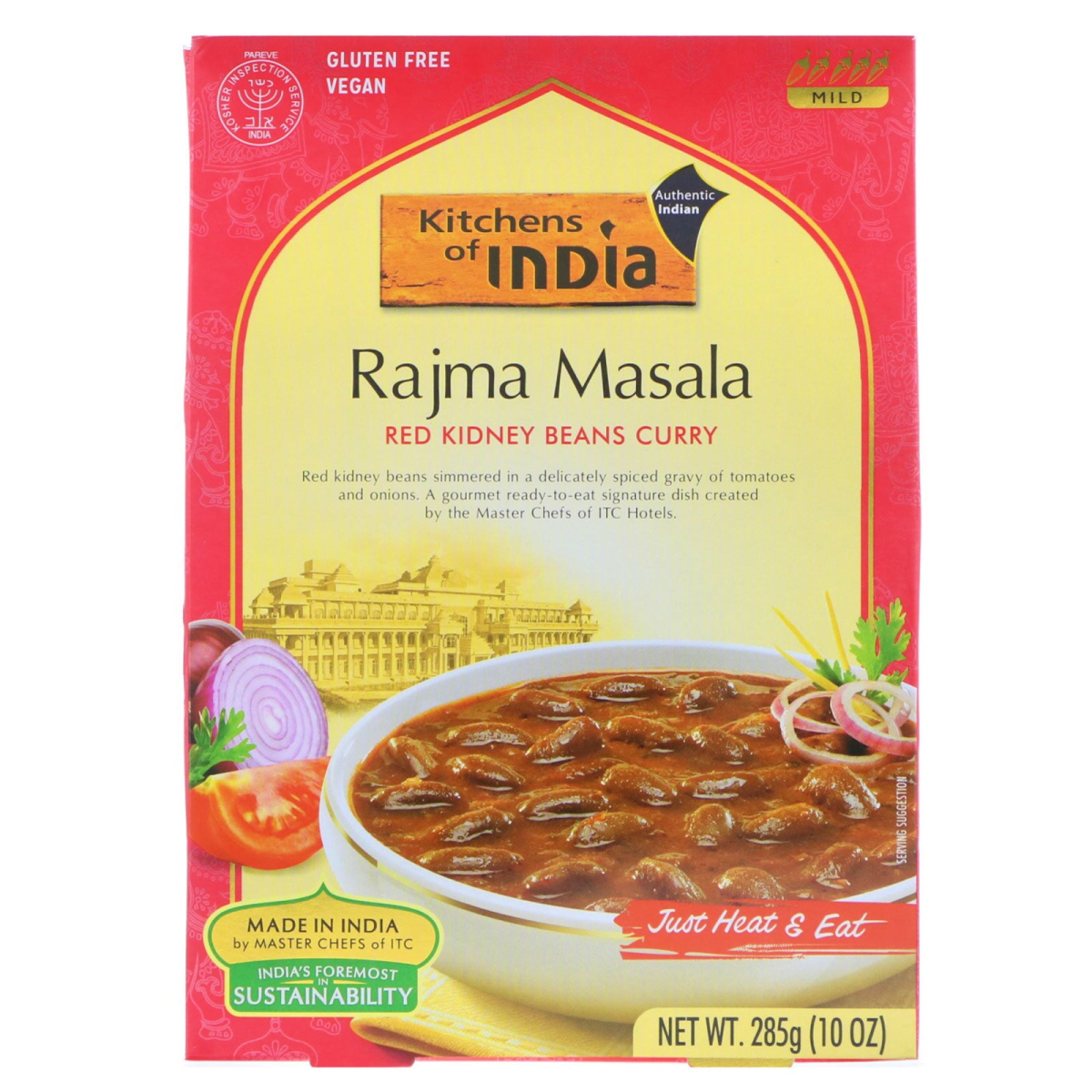 Just Heat & Eat Authentic Indian Kosher Inspection Service - Pareve Gluten Free Vegan Made in India by Master Chefs of ITC India's Foremost in Sustainability Red kidney beans simmered in a delicately spiced gravy of tomatoes and onions. A gourmet ready-to-eat signature dish created by the Master Chefs of ITC Hotels. Rajma Masala is an authentic Indian recipe, created by the Master Chefs of ITC Hotels. Red kidney beans are simmered in a delicately spiced gravy of tomatoes and onions, creating a distinctive flavor. This gourmet delight is now available in a ready-to-eat pack.