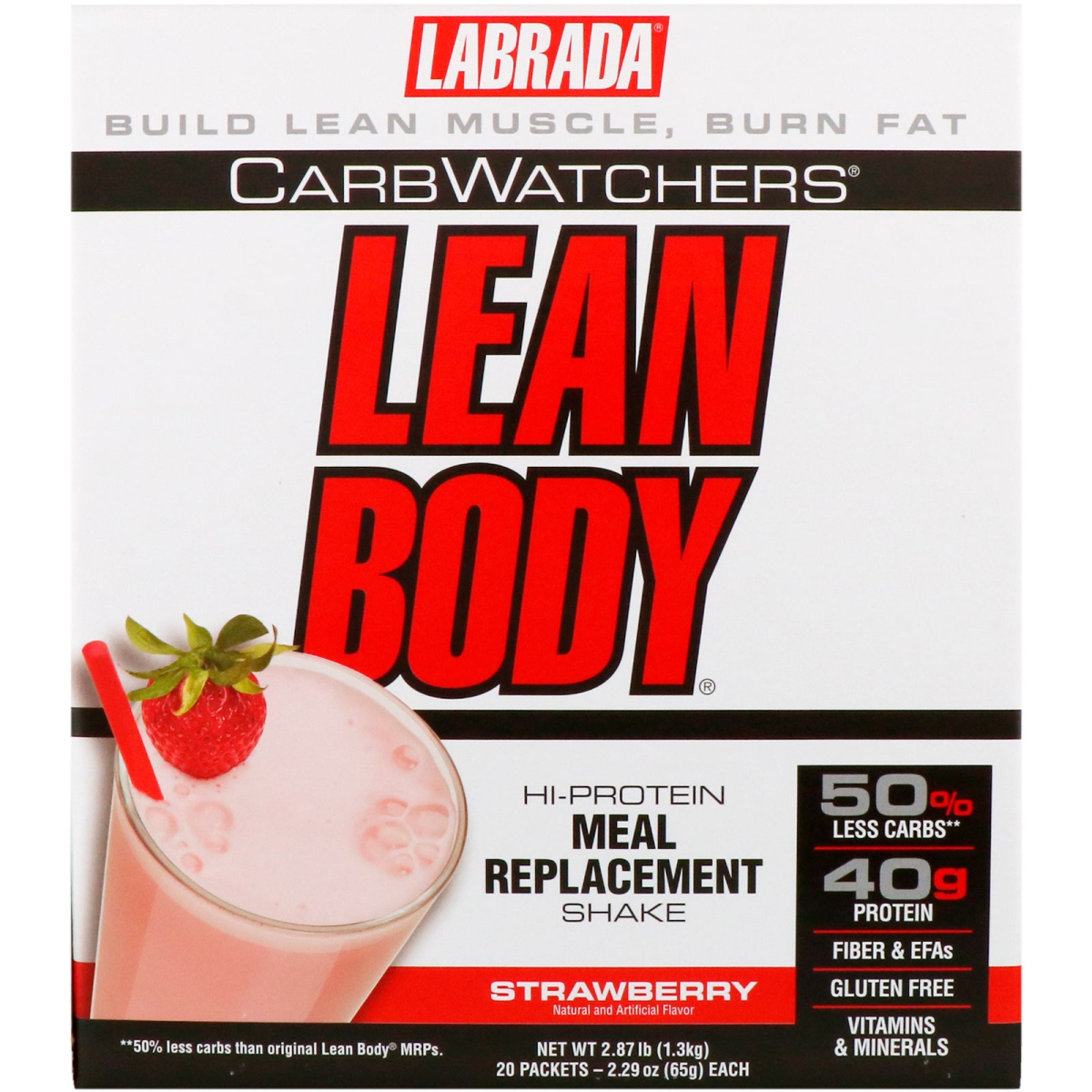 Build Lean Muscle, Burn Fat Natural and Artificial Flavor 50% Less Carbs** 40 g Protein Fiber & EFA's Gluten Free Vitamins & Minerals **50% less carbs than original lean body "CarbWatchers Lean Body is the best tasting, reduced carbohydrate, hi-protein meal replacement drink ever made. CarbWatchers Lean Body takes the guesswork out of low carb eating. CarbWatchers Lean Body was designed to provide athletes with a concentrated source of lean protein and essential nutrients in a delicious, easy-to-use shake. Staying in great shape and performing at your peak is a snap with CarbWatchers Lean Body. Eat right, exercise hard and use CarbWatchers Lean Body every day!" Lee Labrada, Founder, Labrada Nutrition Lee Labrada's Quality Guarantee - "If it's on the label, it's in the product!" This product is independent lab assayed for purity. For over 20 years, Labrada has performed independent third party product testing at analytical laboratories. With Labrada, you can be sure that your product meets label claim. "If it's on the label, it's in the bottle!" CarbWatchers Lean Body reduced carb meal replacement shakes provide quick, delicious lean muscle nutrition for active people. Enjoy lean body's smooth, creamy, award-winning taste! CarbWatchers Lean Body satisfies your appetite and makes you feel great without a lot of carbohydrates. Use CarbWatchers Lean Body in conjunction with your exercise program to help you build lean muscle and burn fat. Delicious taste! CarbWatchers Lean Body may be the best tasting meal replacement powder (MRP) ever made. That's why the American Culinary Institute awarded Lean Body a Gold Medal Taste Award. 65/20/15 (protein/carbohydrate/fat) ratio of macronutrients consisting of highly bio-available protein, high-fiber complex carbohydrates and essential fatty acids, to support lean muscle growth, strength, and higher energy all day long! 40 g of LeanPro high-quality protein to provide lean muscle support. Over 7,000 mg of BCAA's (Branched Chain Amino Acids) for muscle tissue support. Over 8,000 mg of Glutamine & Glutamic Acid. to promote recovery. 12 grams of an advanced blend of low-glycemic, high-fiber carbohydrates to help stabilize your blood sugar and insulin levels, to promote greater energy and fat burning. 4 grams of FiberPlex dietary fiber per serving to support intestinal health. 4 grams EFA-Plex containing natural-source fatty acids, medium-chain triglycerides, flaxseed oil and borage oil. Contains 21 vitamins & minerals. No artificial flavors or preservatives No Aspartame or maltodextrin No Trans Fat Gluten free