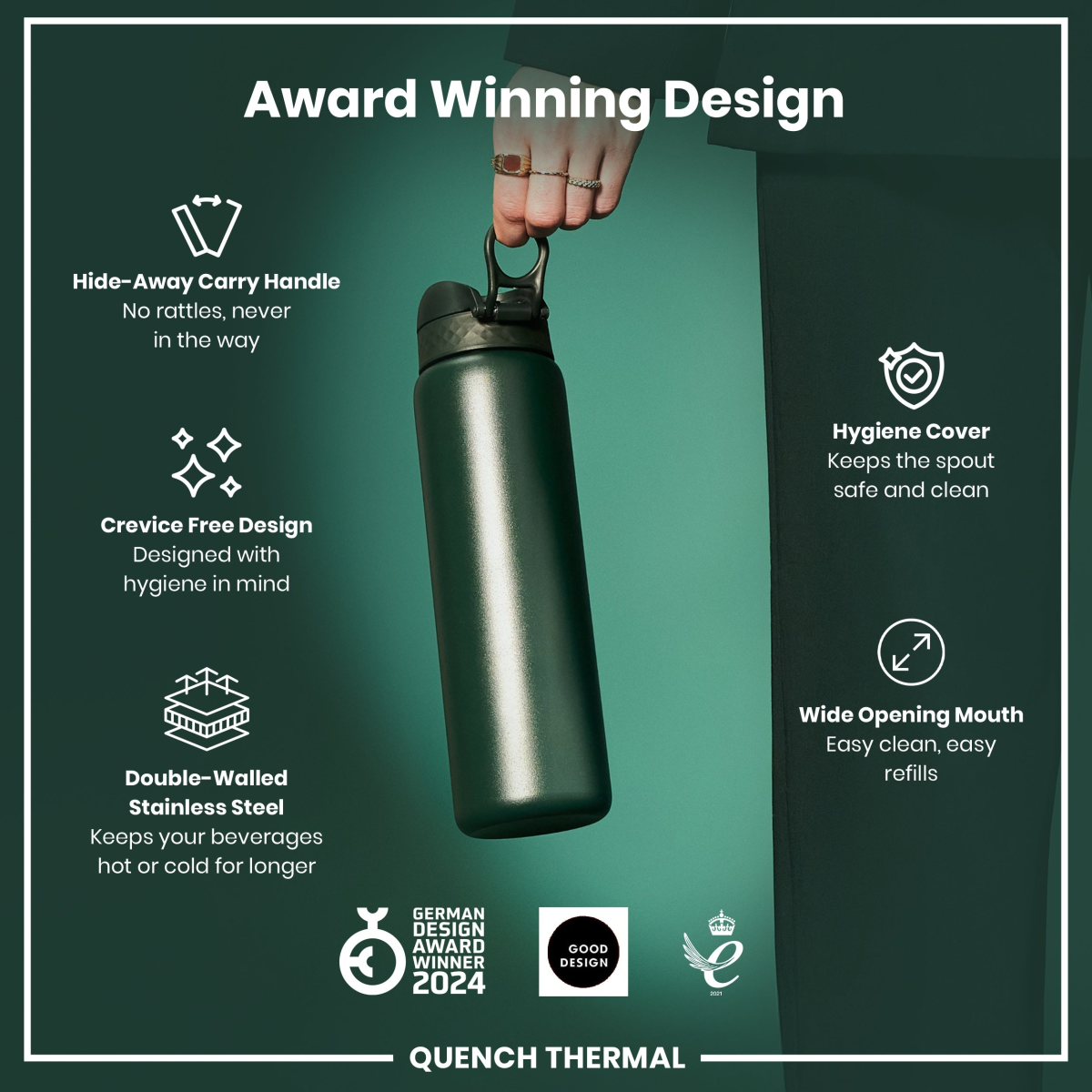 Leak Proof 1 Litre Thermal Water Bottle, Insulated Steel, Dark Green, 1L