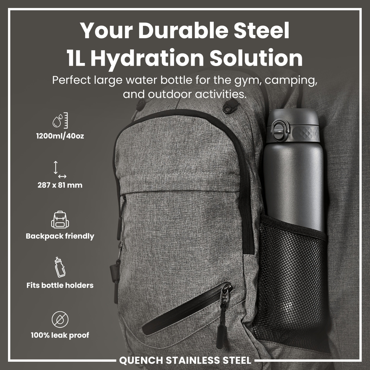 100% leak proof 1200ml / 40oz lightweight stainless steel grey water bottle with a smooth flow for spill-free hydration and hygienic full-flip top cover for one handed use on-the-go.