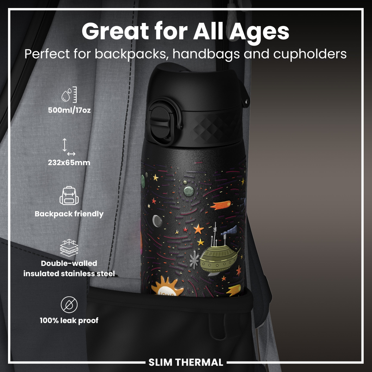 Leak Proof Slim Thermal Water Bottle, Insulated Steel, Spaceships, 500ml (17oz)