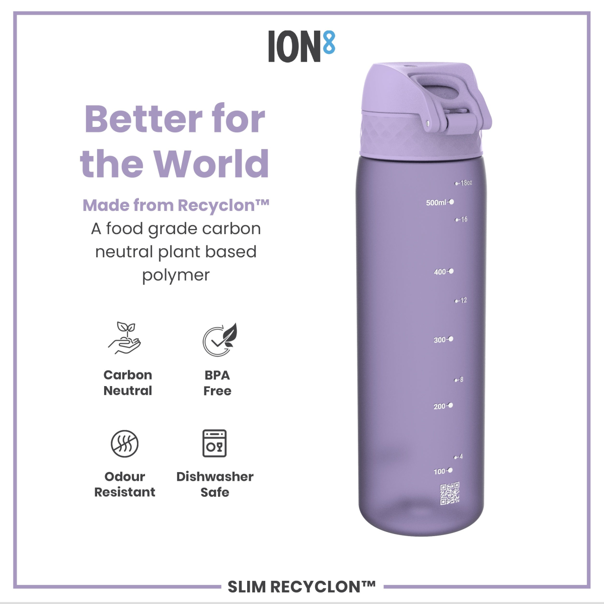 Made from Recyclon™, a transparent carbon neutral plastic partly made from plants. Reuse & refill responsibly. This purple water bottle is food safe, odour resistant, easy to wash, and keeps drinks fresh and full of flavour.