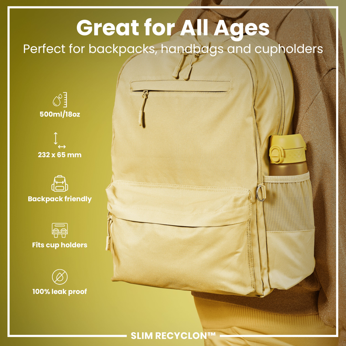 Leak Proof Slim Water Bottle, Recyclon, Yellow, 500ml (18oz)