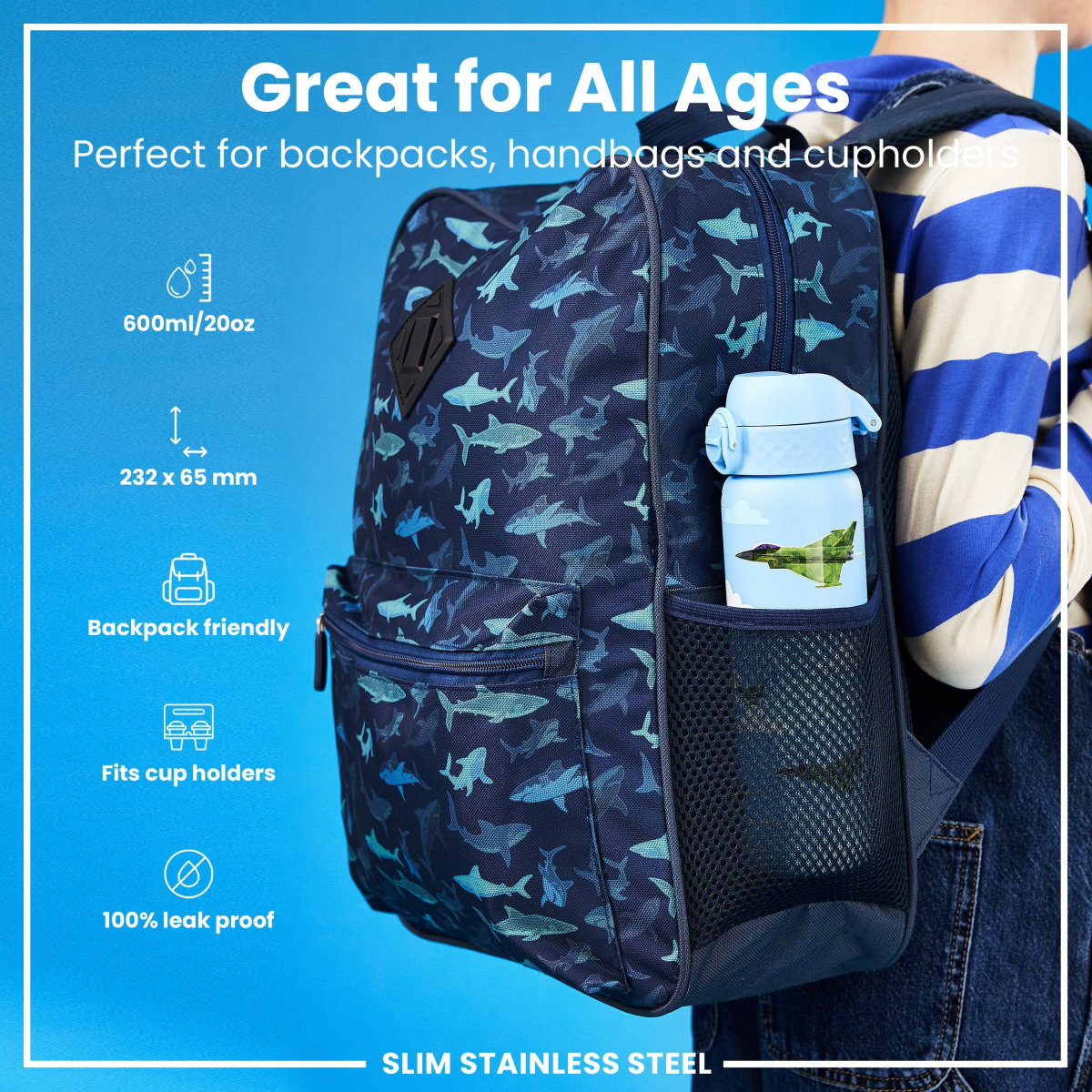Leak Proof Slim Water Bottle, Stainless Steel, Fighter Jets, 600ml (20oz)
