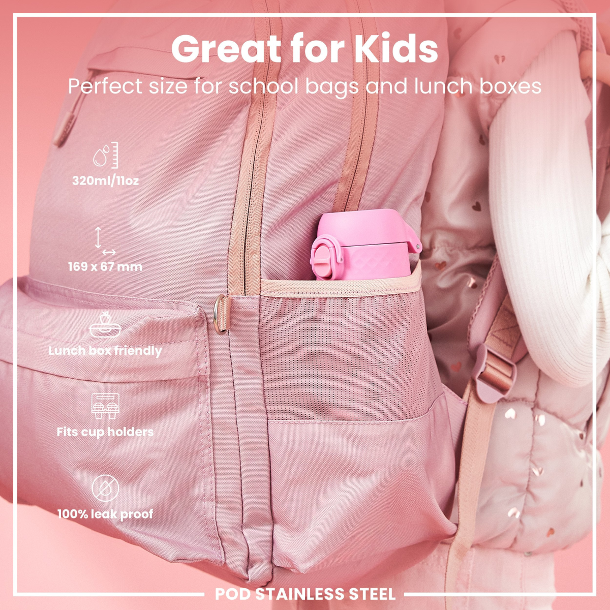 100% leak proof 320ml / 11oz kids vacuum insulated double wall stainless steel water bottles with a smooth flow for spill-free hydration and hygienic full-flip top cover for one handed use on-the-go. Keeps hot drinks hot and cold drinks icy cold and fresh for hours.