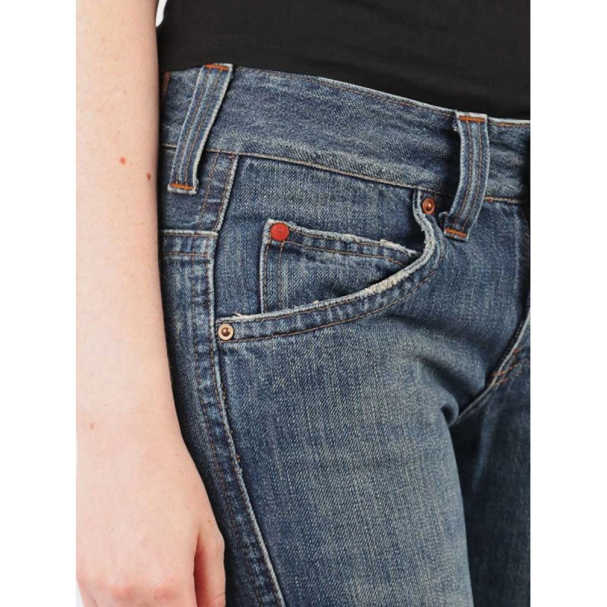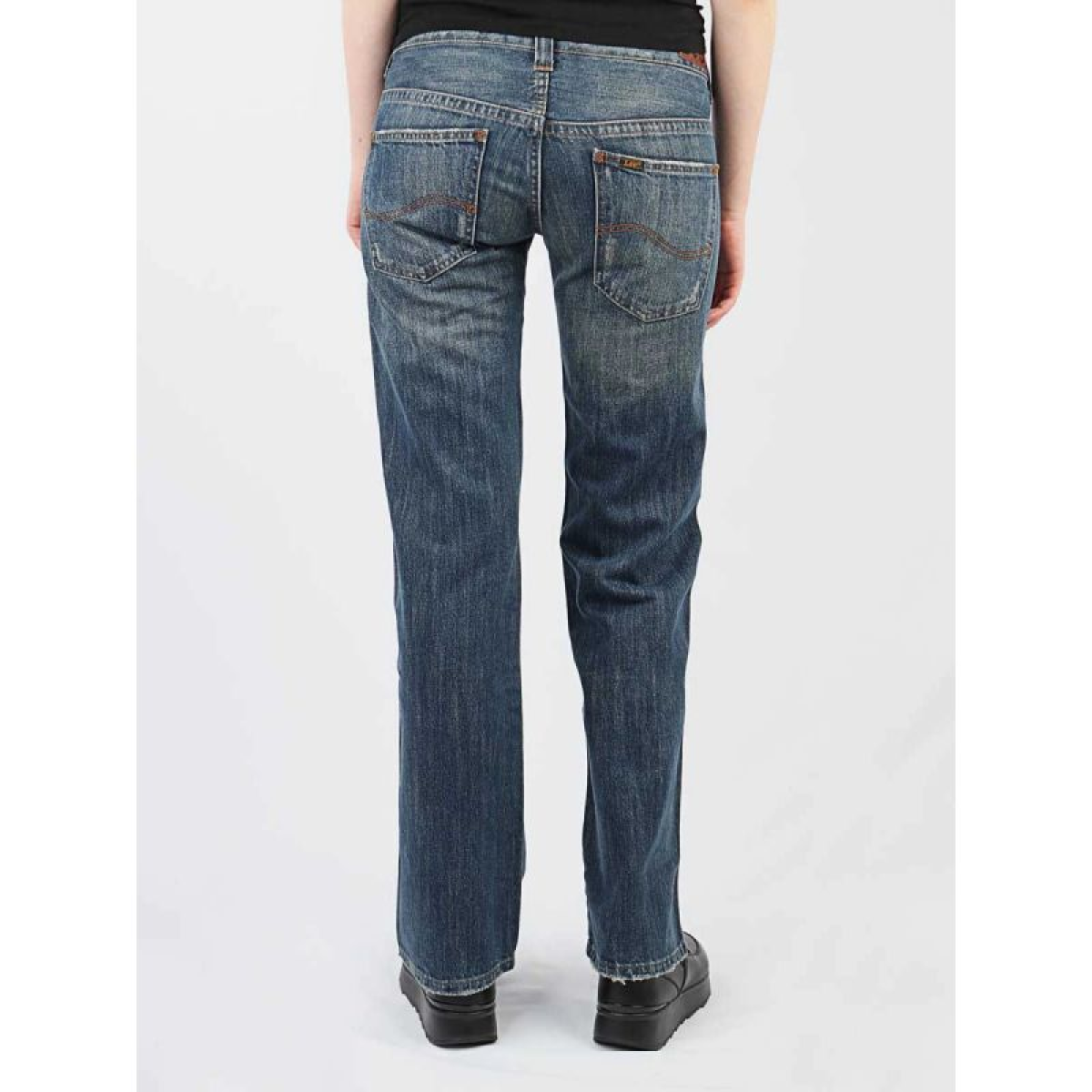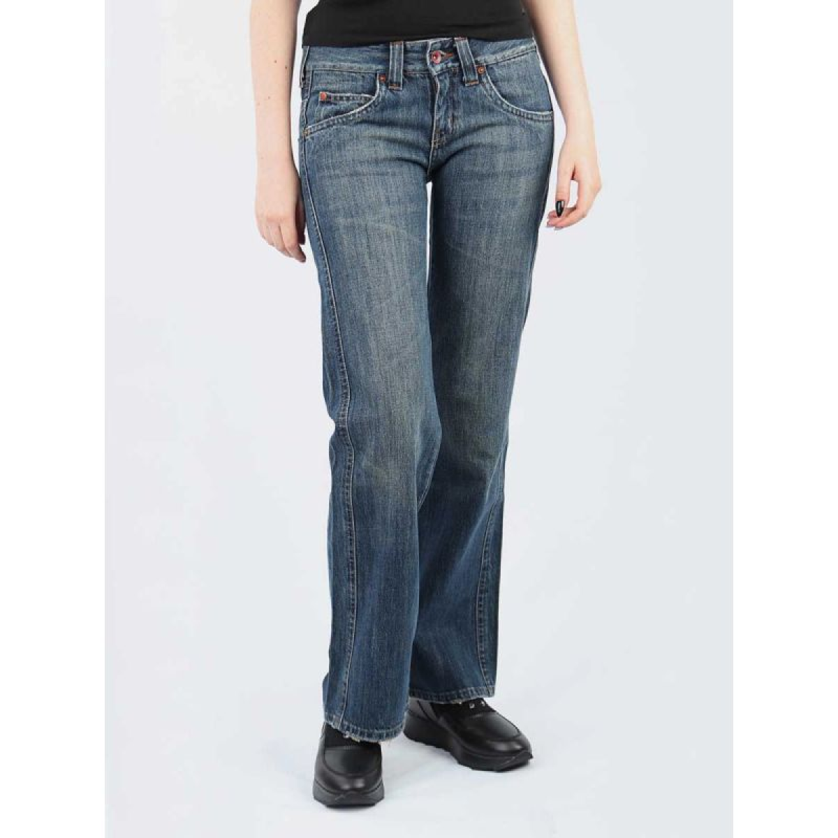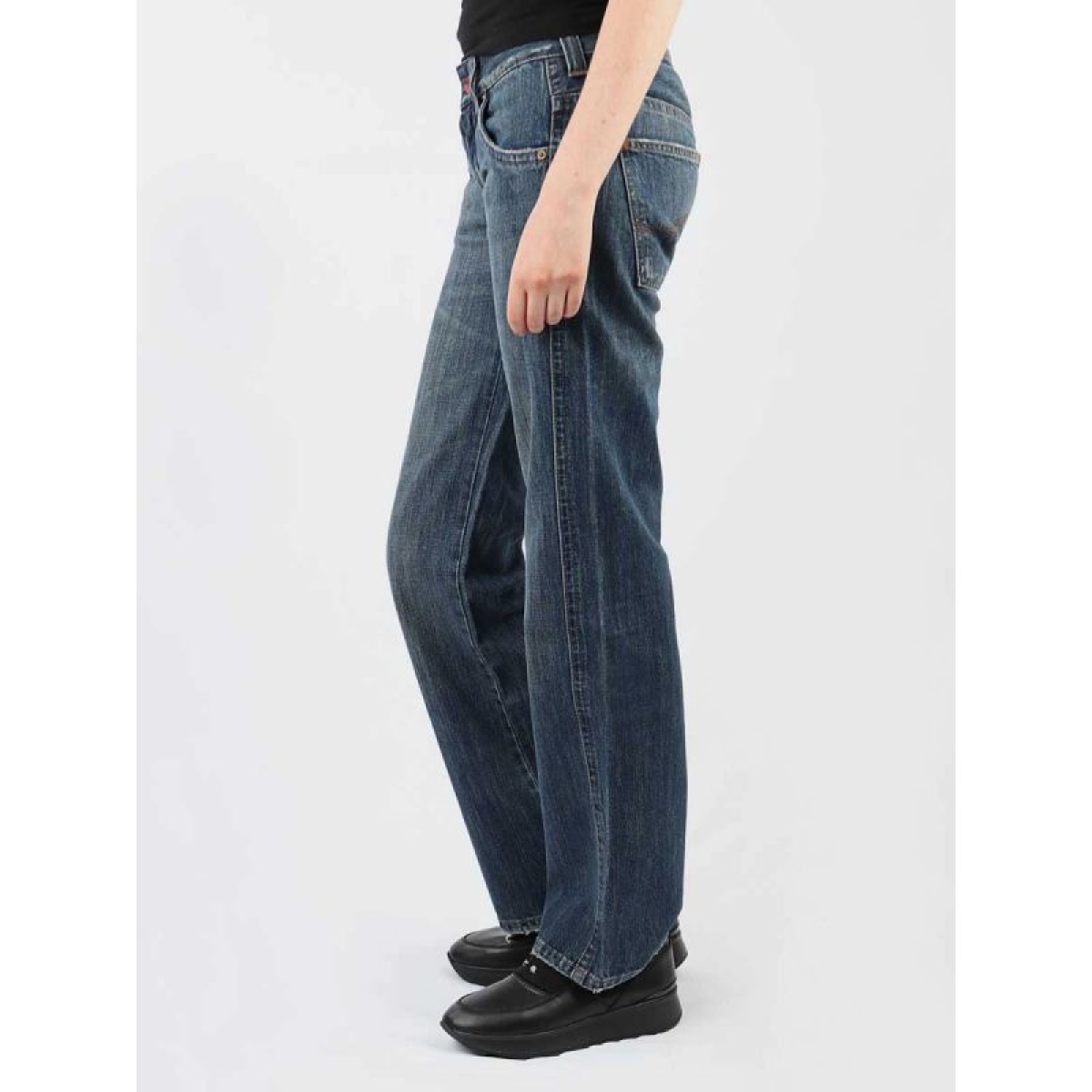 Women's regular-rise straight-leg jeans with a zipper closure. A leather logo patch is featured on the back waistband.