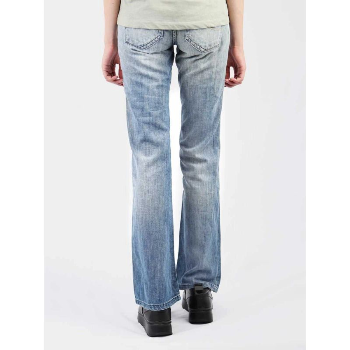 Women's low-rise jeans with flared legs. Zipper closure. Leather logo patch on the back waistband.