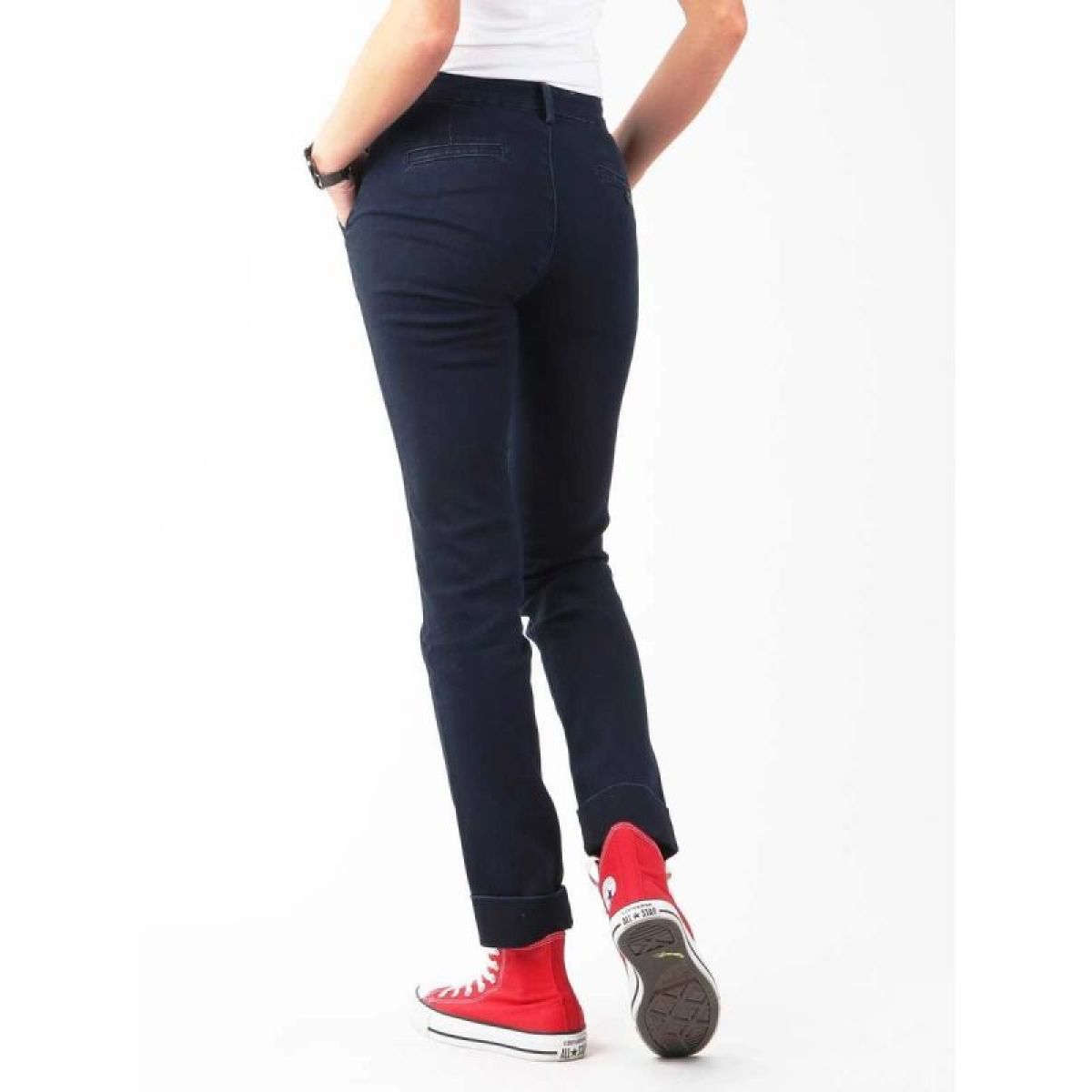 Cut: fitted, tapered legs, mid-rise Material: 62% cotton, 24% polyester, 2% elastane