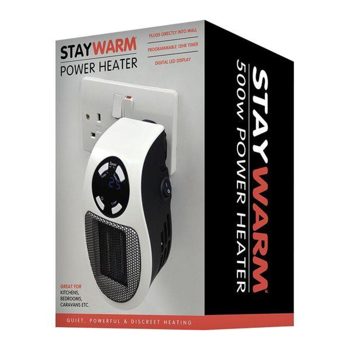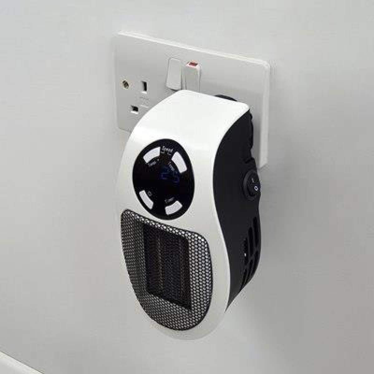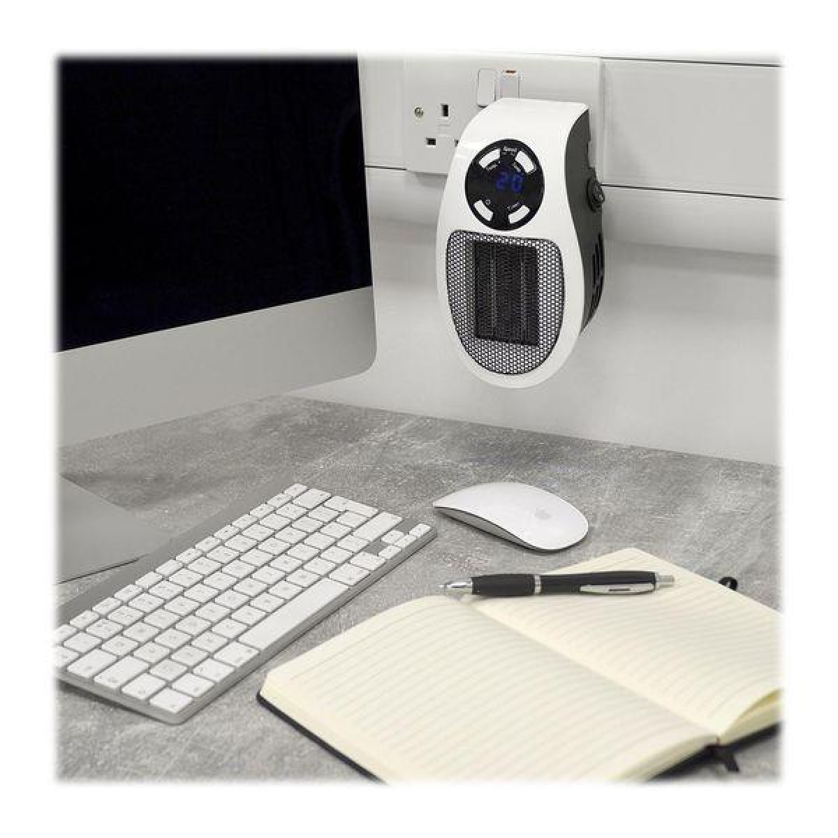 Direct plug in to mains socket 500w power Ceramic PTC heater 2 fan speeds low or high Fan - 60 sec delay after shut off LED display showing temperature fan speed and timer 15-30 degree celsius temperature setting 1-12 hour timer setting to turn off Overheat protection Illumianted power light at bottom Colour: white Packaging: gift box