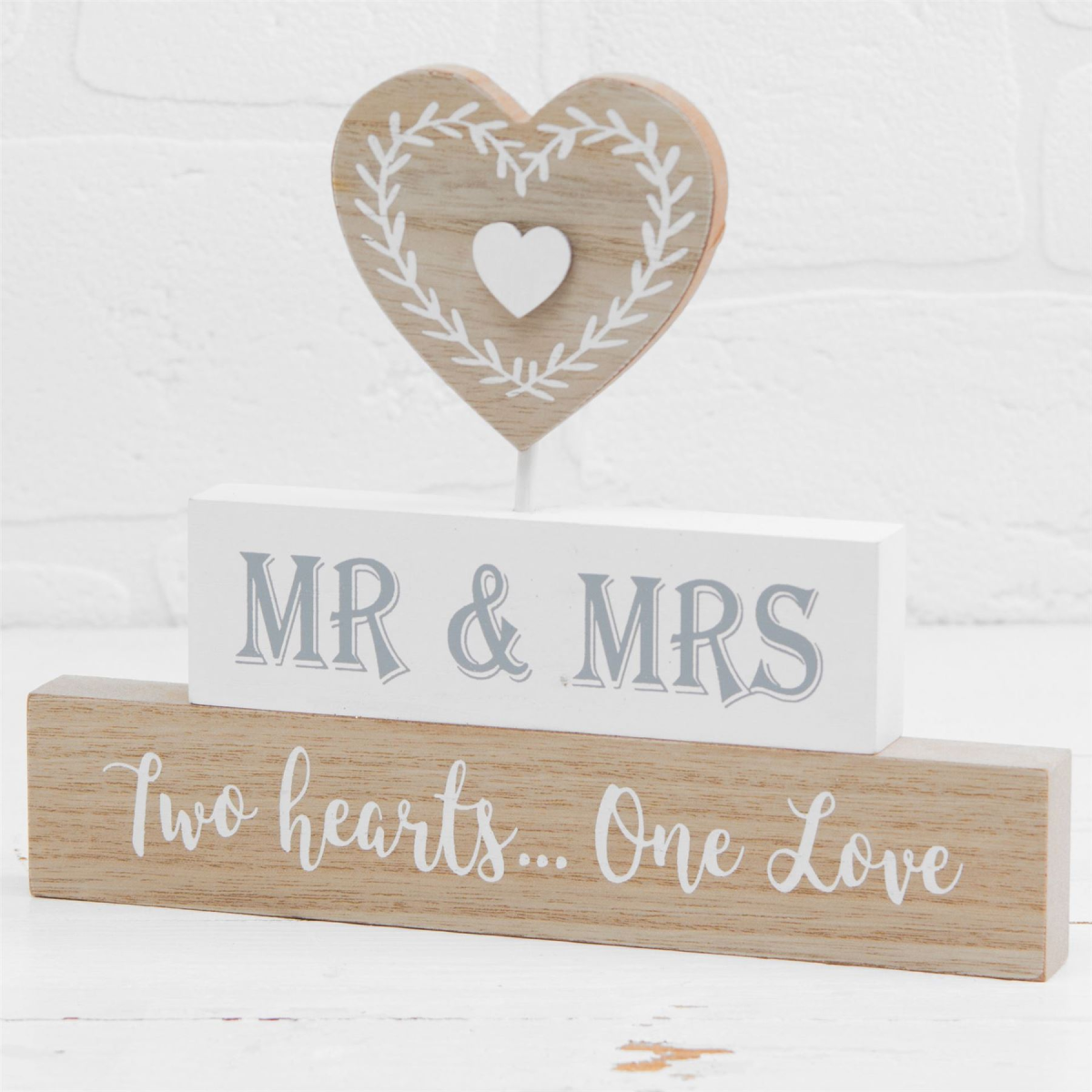 Dress a shabby-chic inspired wedding with this wonderful 'two hearts' mantel plaque from Love Story. This wonderful freestanding plaque is a great addition to any wedding and will fit well within a shabby-chic inspired decor. The light wood plaque features a block design with 'Mr & Mrs, two hearts... One love' wording beneath a cut out heart.