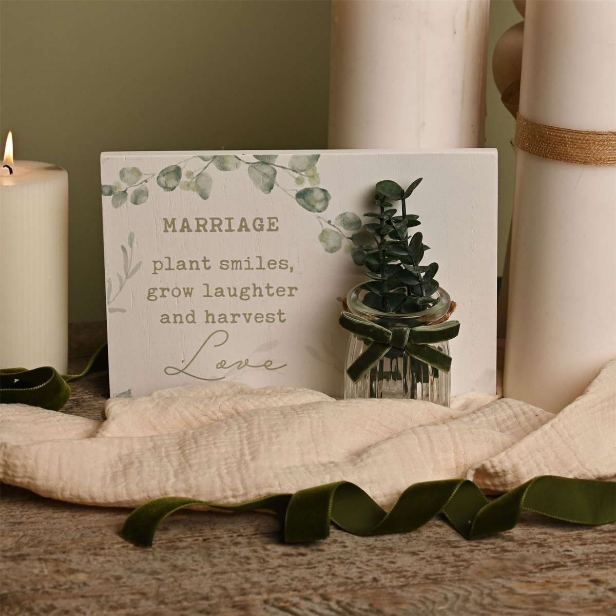 A Marriage jar plaque from Love Story by CELEBRATIONS�. This original plaque is a symbol of togetherness for display at home. The rectangular wall display showcases a white finish, complete with printed leaf design and �Marriage � Plant Smiles, Grow Laughter and Harvest Love� title. It is completed by an attached glass jar, which houses artificial foliage, complete with rope and a green velvet bow tied around the jar�s neck. The plaque is packaged in a closed brown box with 1c print.