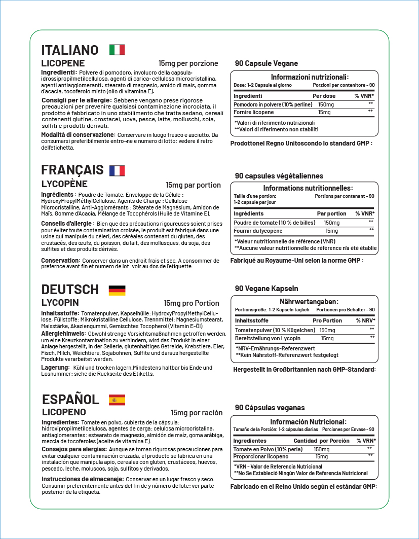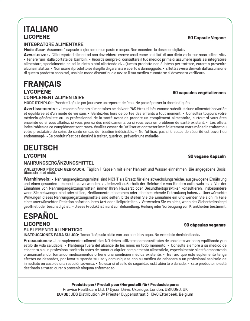 Prowise Lycopene capsules are manufactured in the UK to GMP code of practice. Only the finest quality raw materials in their highest and purest form are used.