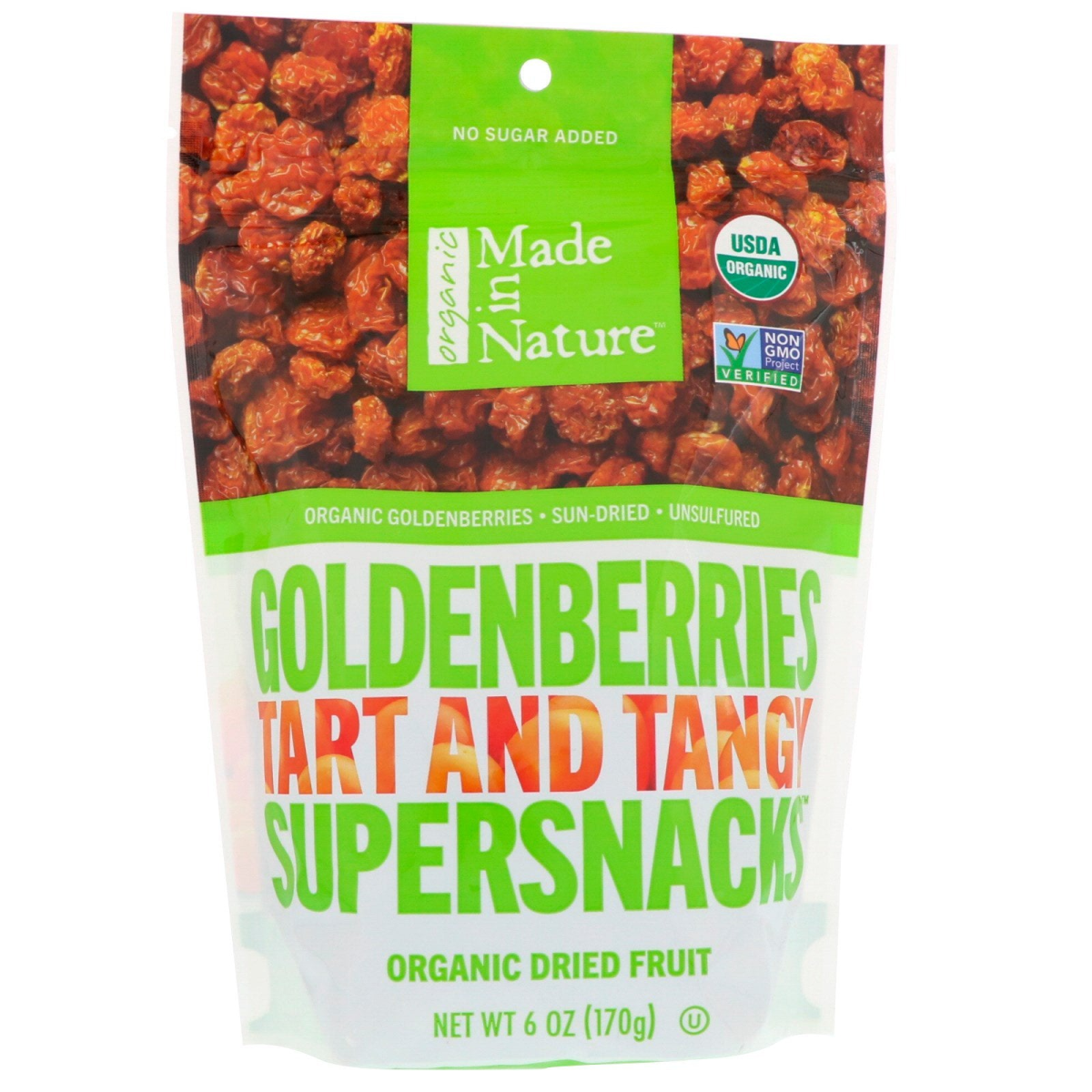 No Sugar Added USDA Non-GMO Project Verified Goldenberries - Sun-Dried - Unsulfured Dried Fruit BPA Free Certified by Quality Assurance International Goldenberries - Wild Child If our vine-ripened, sun-dried Goldenberries leave you feeling even an ounce of "meh," you may need to see someone about that. Straight up: this fruit is not for the weary. It was literally born to be brazen. Grown in the magnificent Andes Mountains, these moist, lip-smacking berries are crazy tart at first–brace yourself–but they end up on a surprisingly sweet note that leaves you begging for more. And more. And more. Each bite is a massive burst of berry flavor straight out of the bag, in a mix or as part of a recipe. And the nutrition? So impressive, it's insane. Good Source of Vitamin C Yellow, Not Mellow Nature Unleashed. The same old, same old has never been our style. At Made in Nature, that means kicking refined sugar to the curb and going all-out in everything we do.
